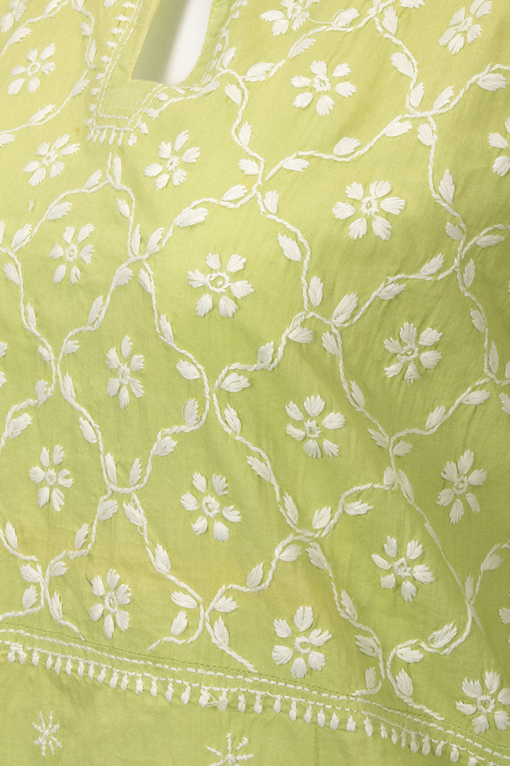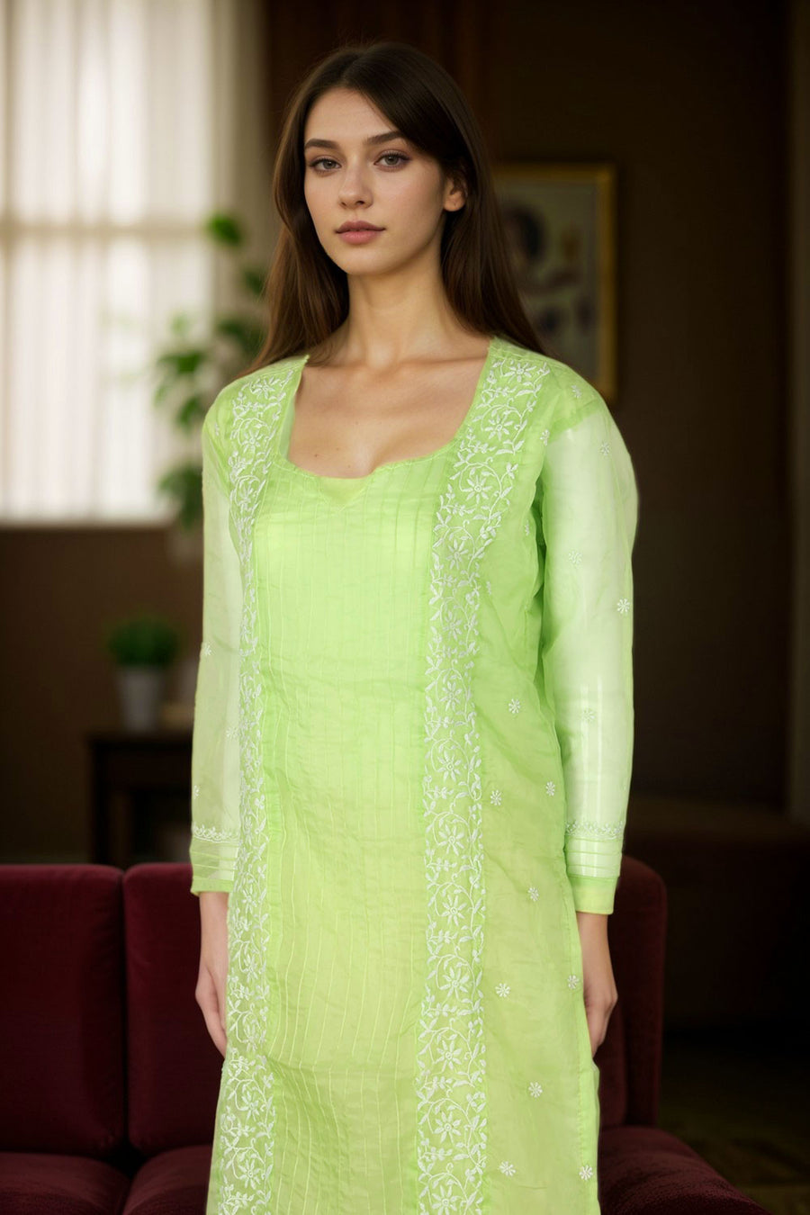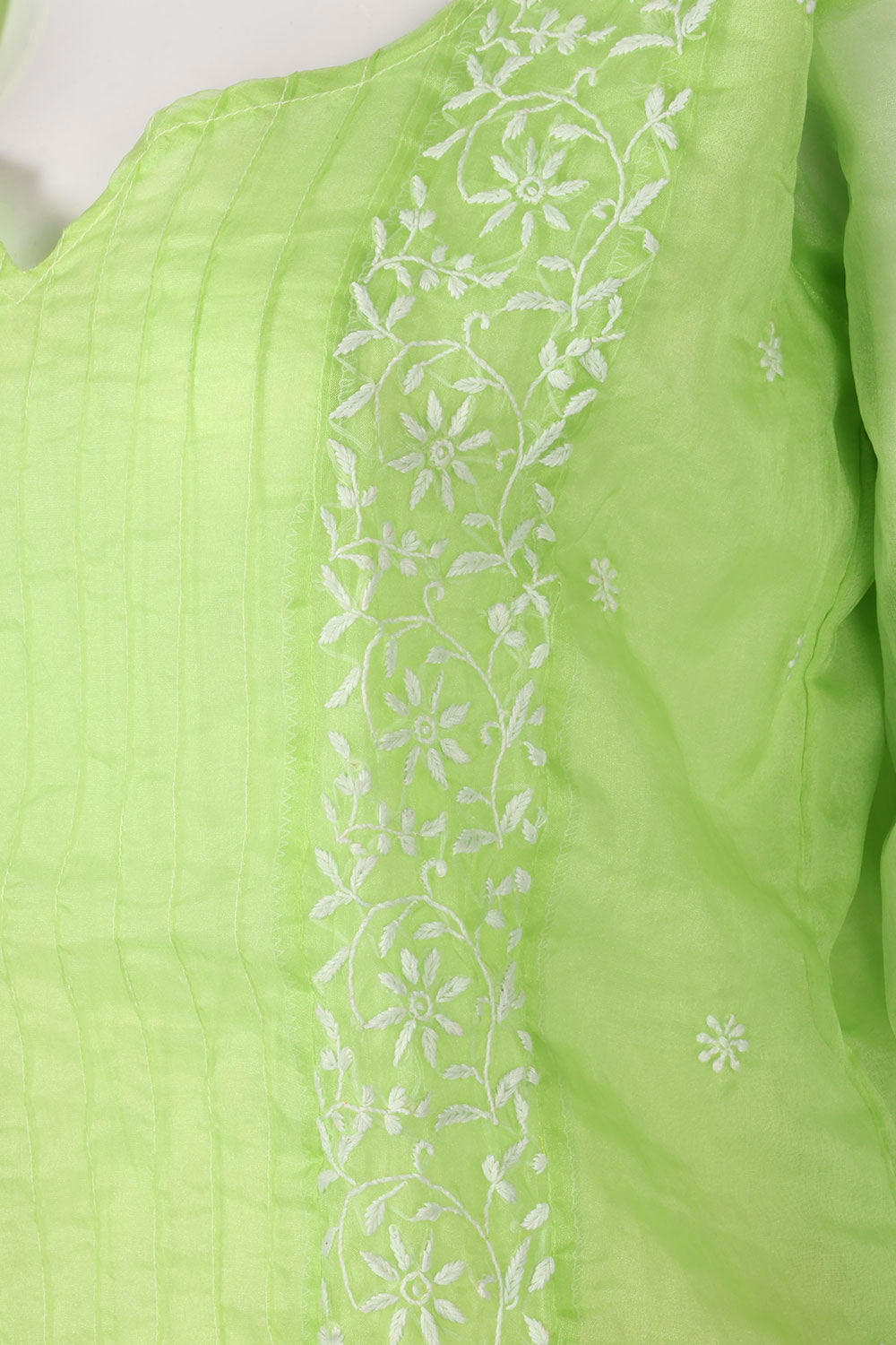 Elevate your ethnic wardrobe with this Green Chikankari Embroidery Organza Kurta. Crafted from delicate organza fabric, it features intricate chikankari embroidery that adds timeless elegance. Lightweight and breathable, this k...