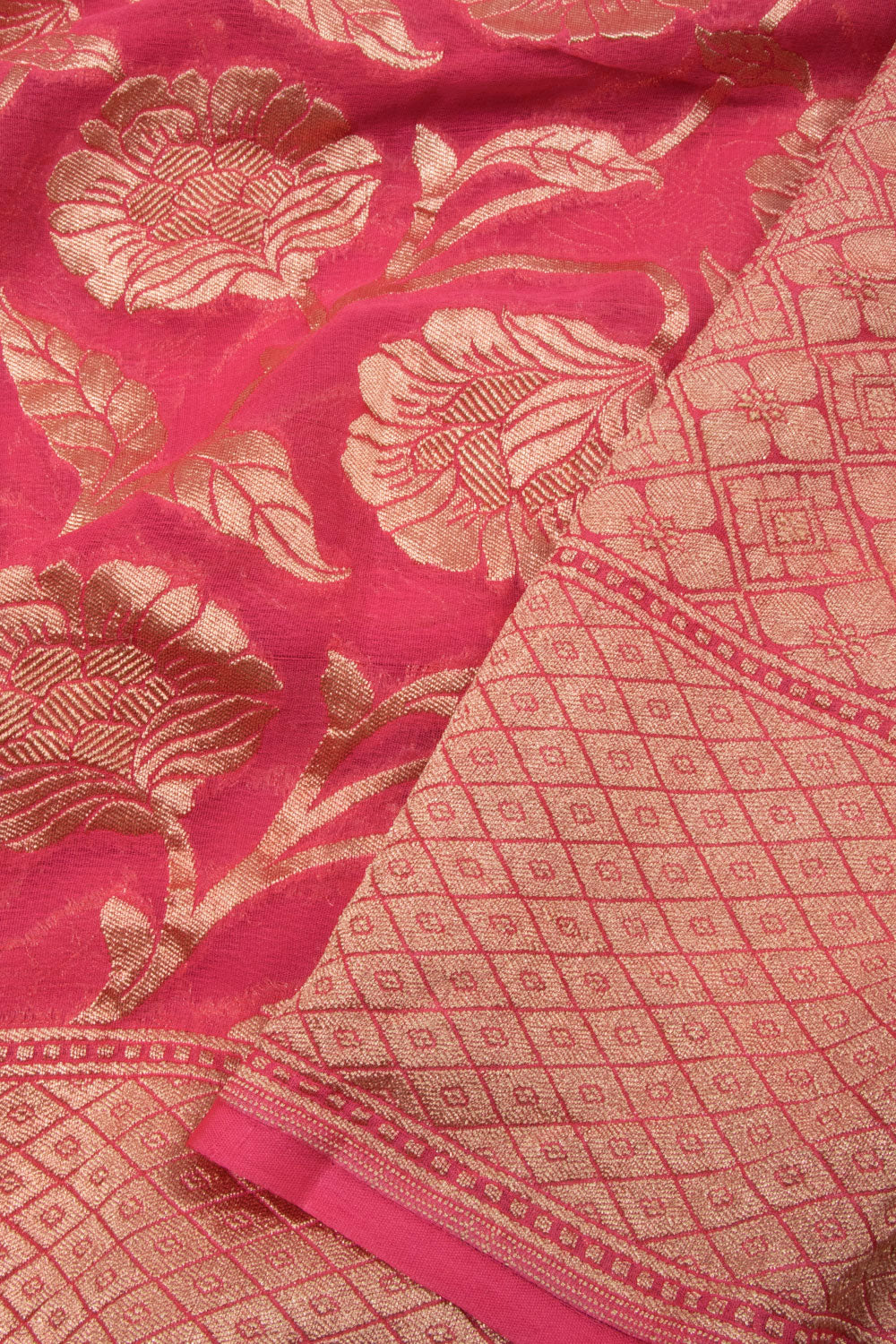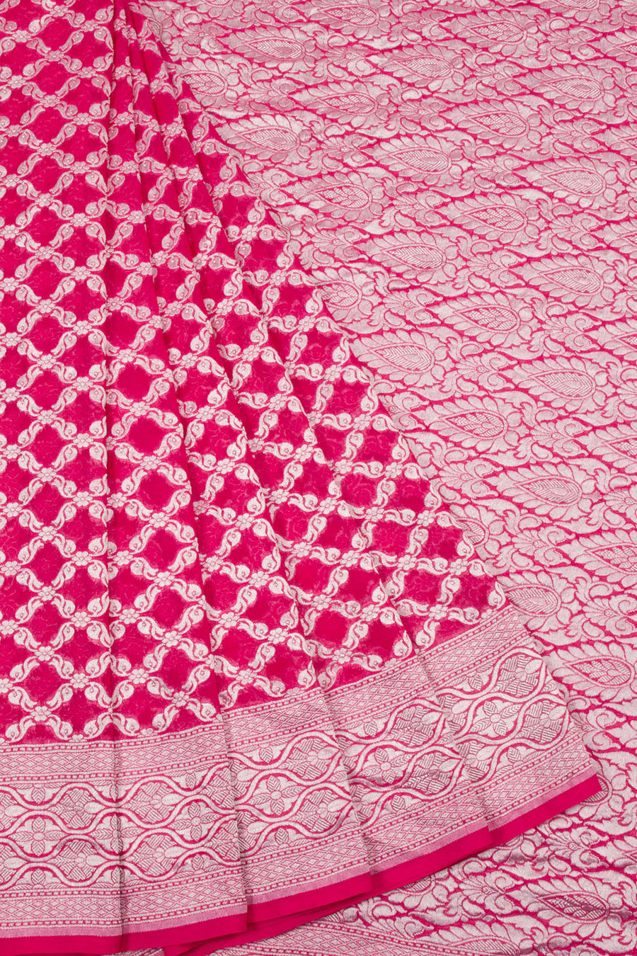 Dark Hot Pink Handcrafted Banarasi Khaddi Georgette Saree with an intricate jaal design adorning the body along with a jangla design on the border and a floral pallu. The vibrant combination of bright pink and sizzling silver z...
