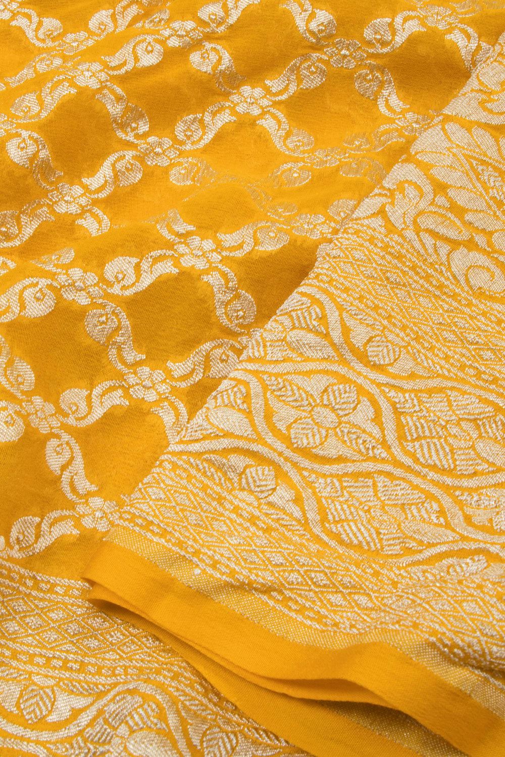 This beautiful Golden Yellow Handcrafted Banarasi Khaddi Georgette Saree boasts exquisite Jaal Design, Jangla Border and Brocade Pallu. Featuring grand zari work across the body, this timeless classic is sure to make a bold fas...