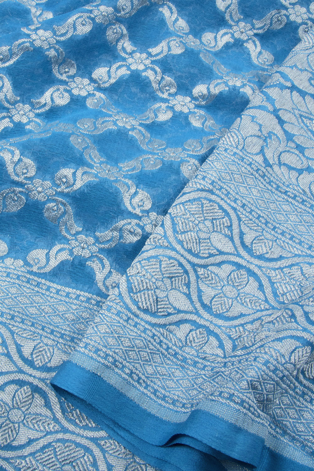 This Cool Blue Handcrafted Banarasi Khaddi Georgette Saree offers a sophisticated and exclusive look. The body features an elegant jaal design and the border and pallu are adorned with beautiful floral motifs. The exquisite han...