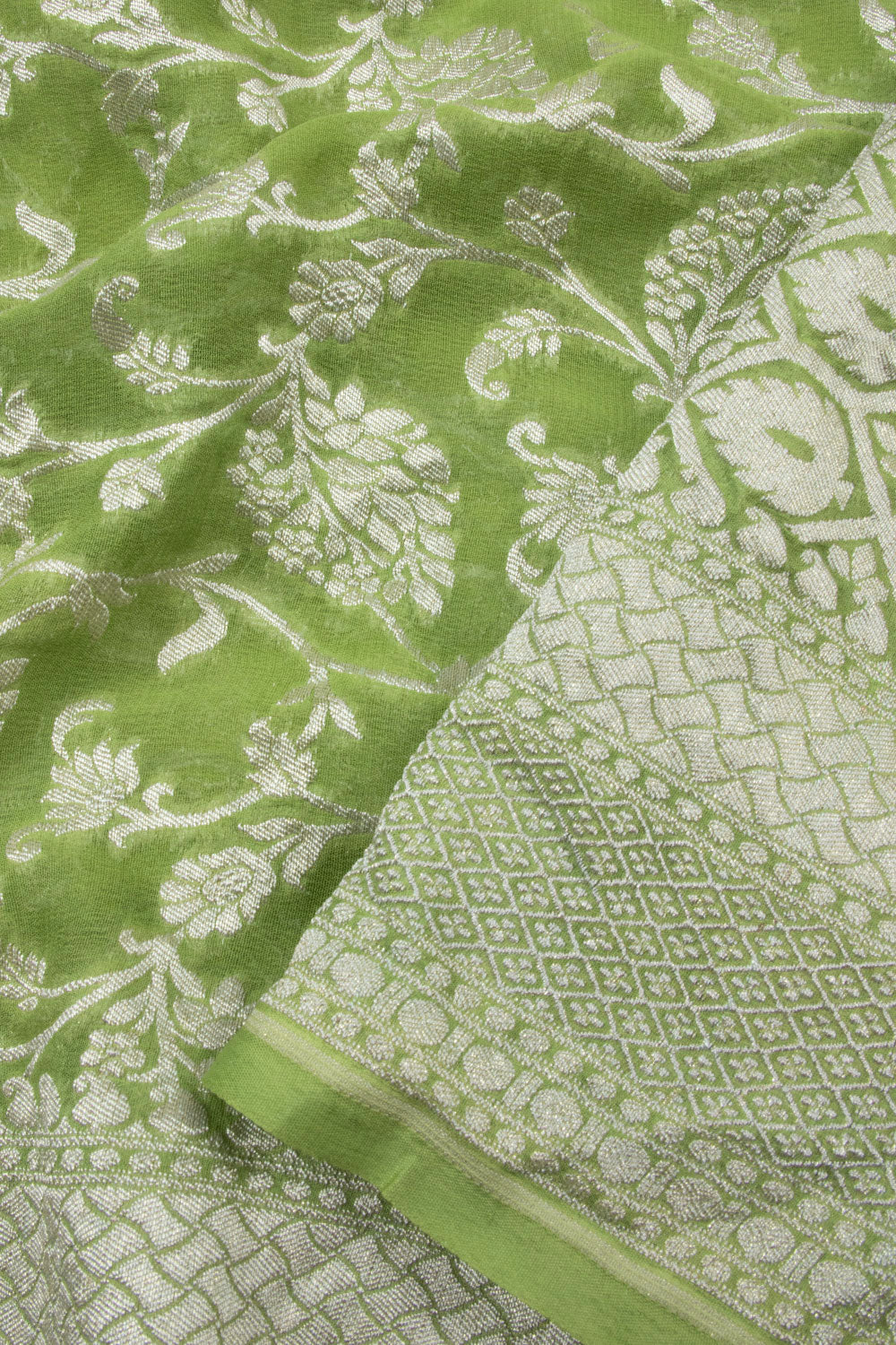 Impress at your next special occasion with this exquisite Avocado Green Handcrafted Banarasi Khaddi Georgette Saree. Constructed from delicate georgette, this luxurious saree displays an intricate Jangla pattern that will draw ...