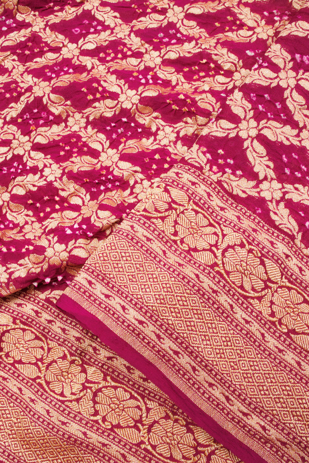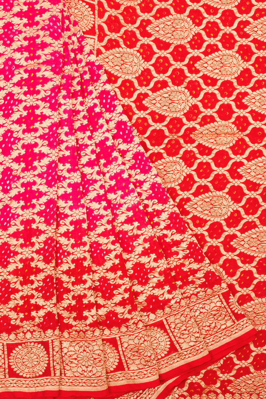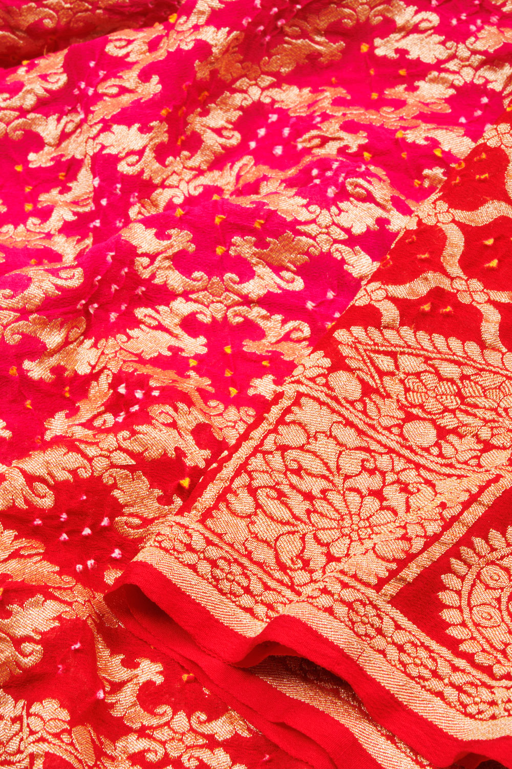 Embrace the beauty of this handmade Pink Handcrafted Banarasi Bandhani Georgette Saree, featuring a coral pink ombre body and a stunning rani pink border and pallu. The intricate Jaal design on the body is complemented by Dana ...