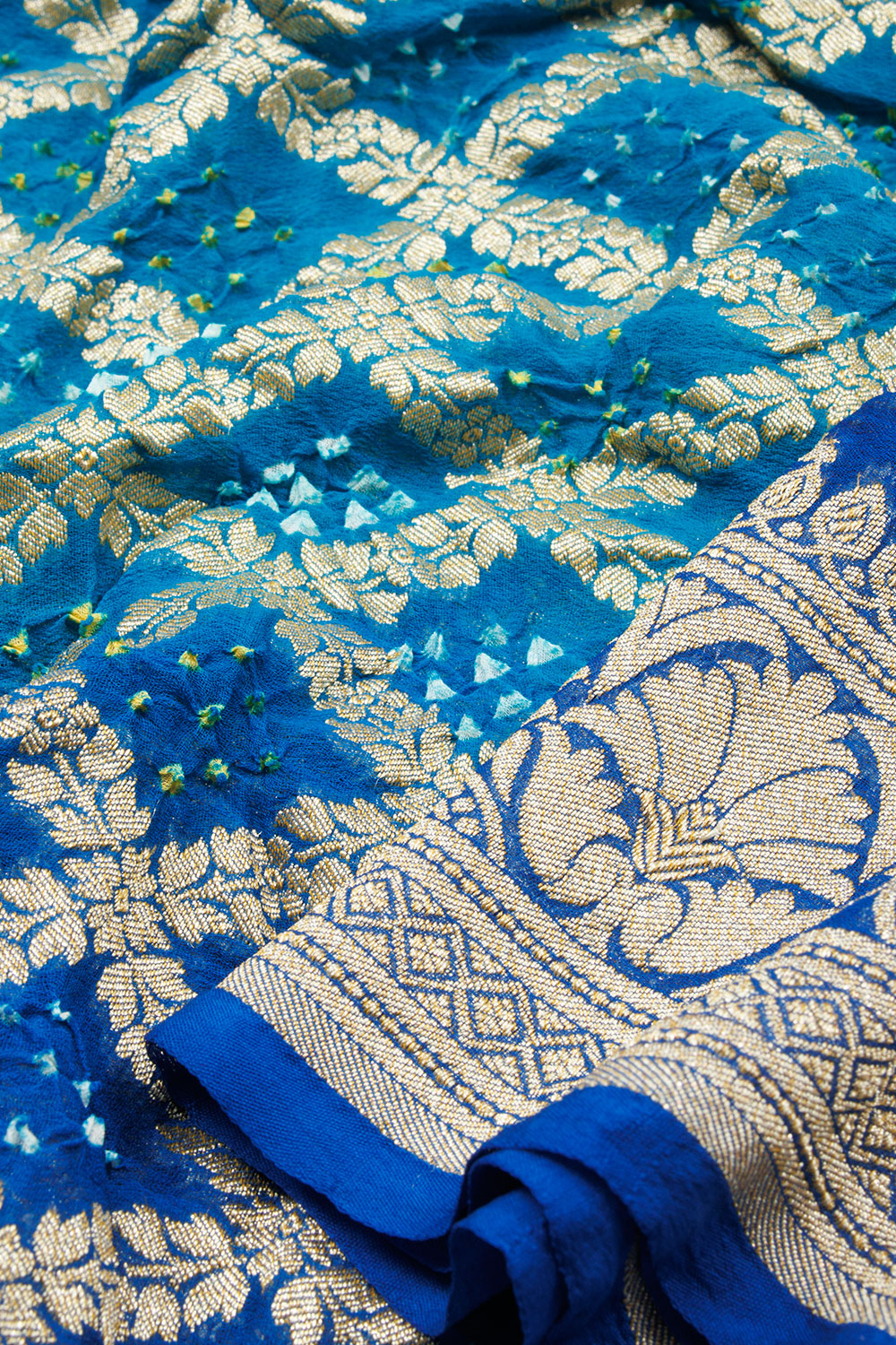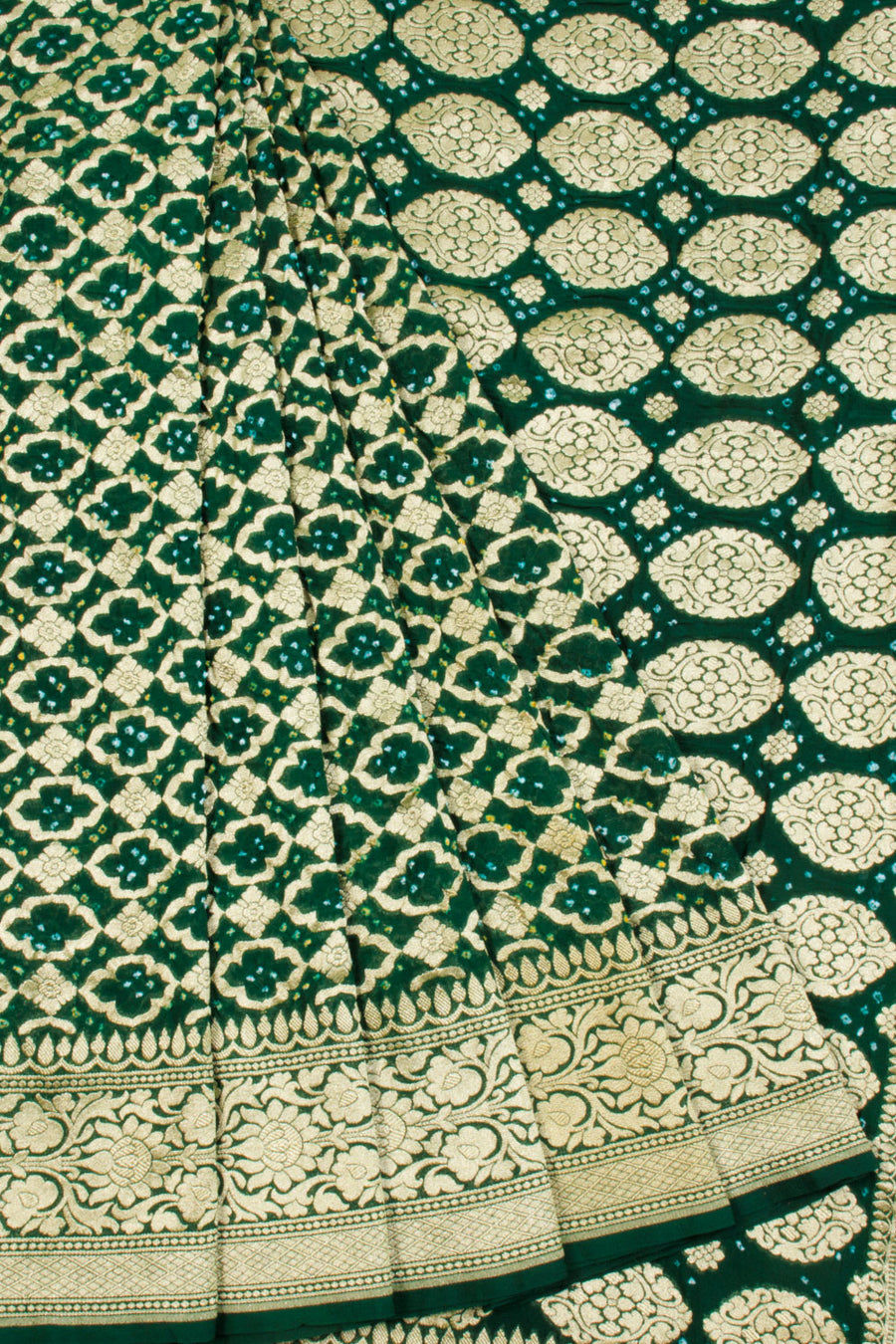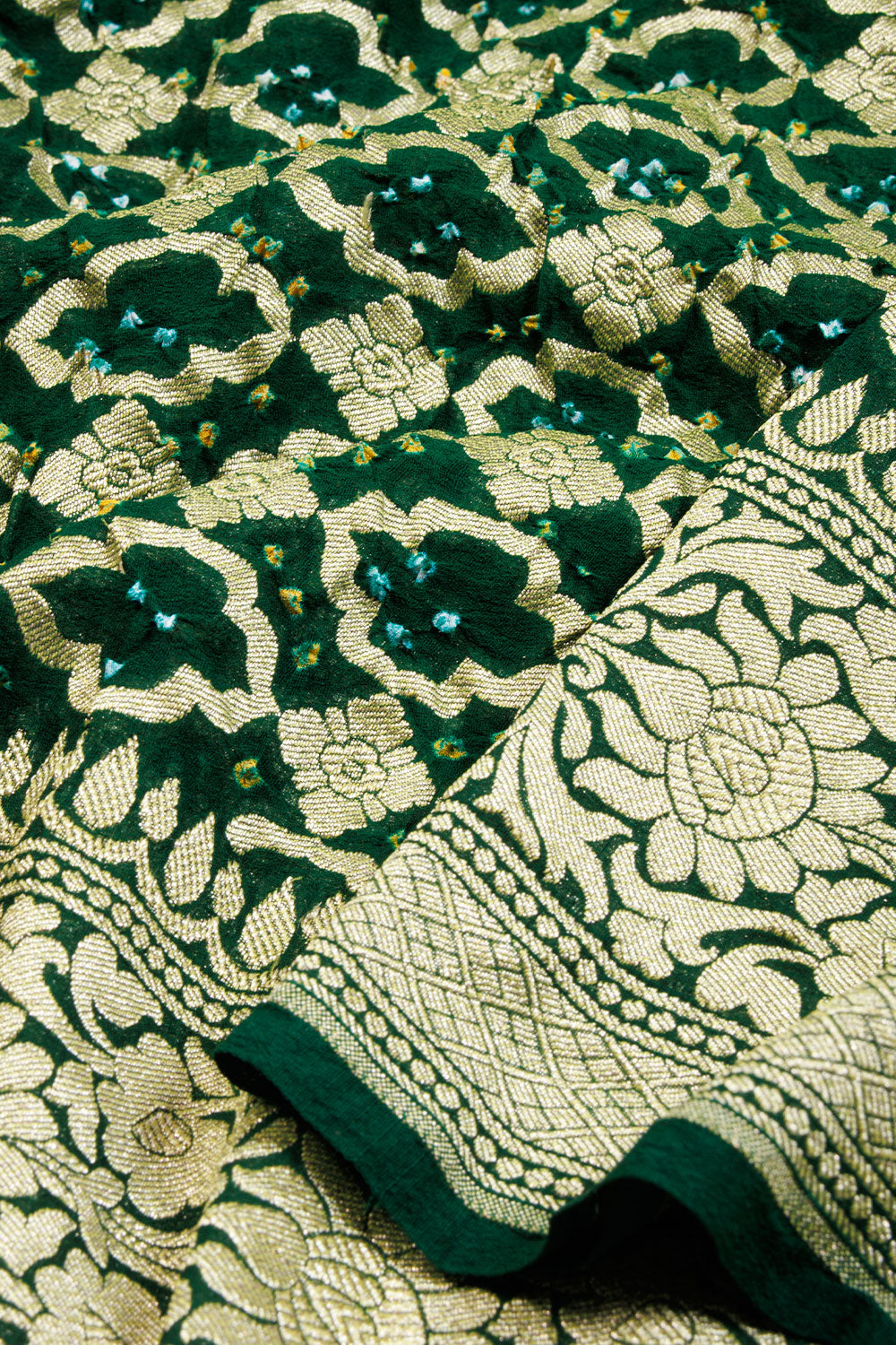 Unleash your inner fashionista with this stunning Green Handcrafted Banarasi Bandhani Georgette Saree! Its intricate jangla and char dana designs exude elegance, while the floral border and pallu add a feminine touch. The dana ...