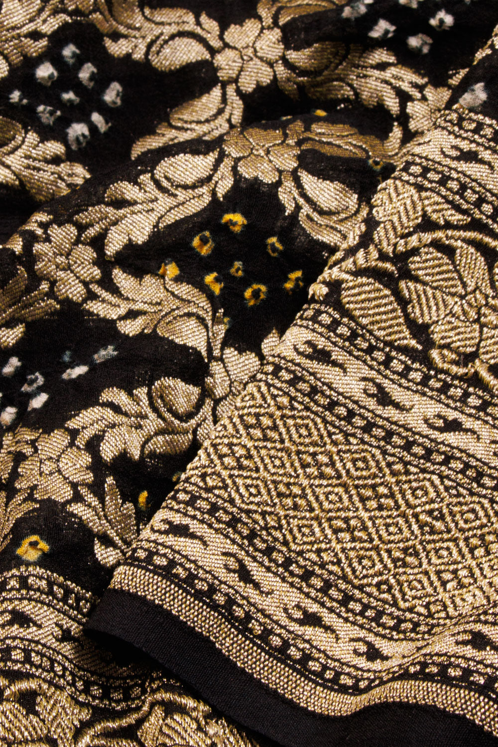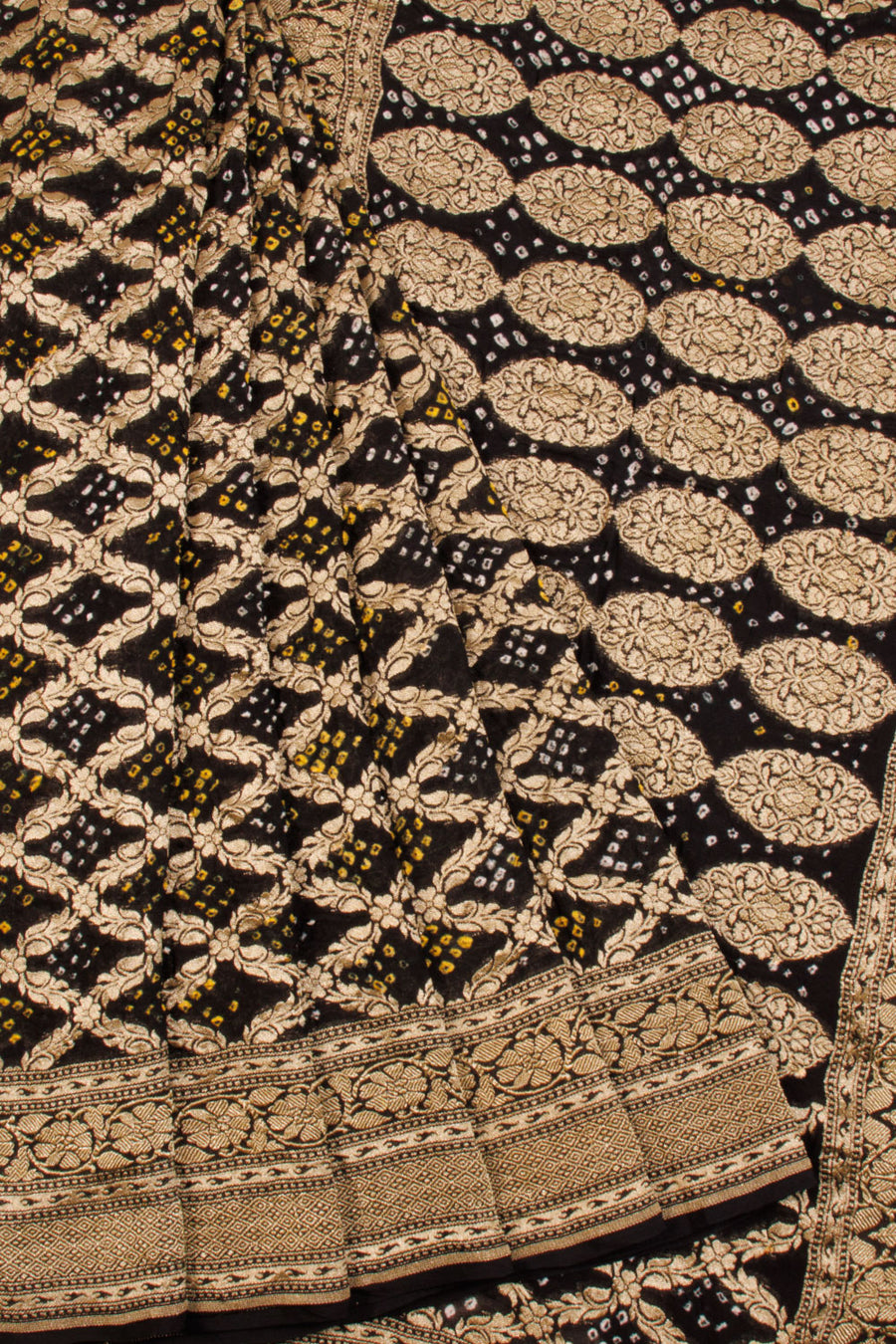 This stunning Black Handcrafted Banarasi Bandhani Georgette Saree boasts a Jangla Design with beautiful Dana patterns in Brown and White. The saree's floral border and pallu feature charming dana motifs, while the matching blou...