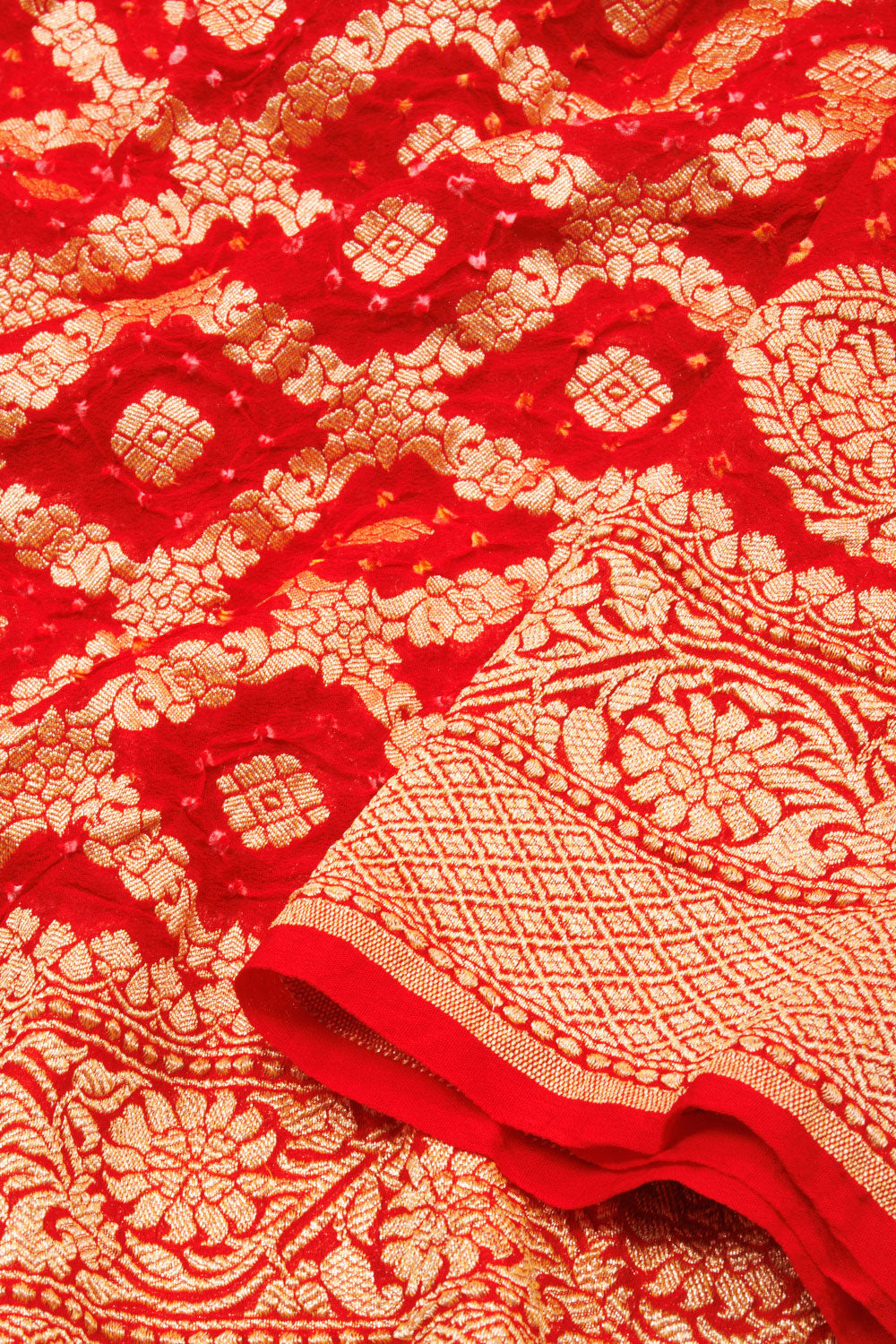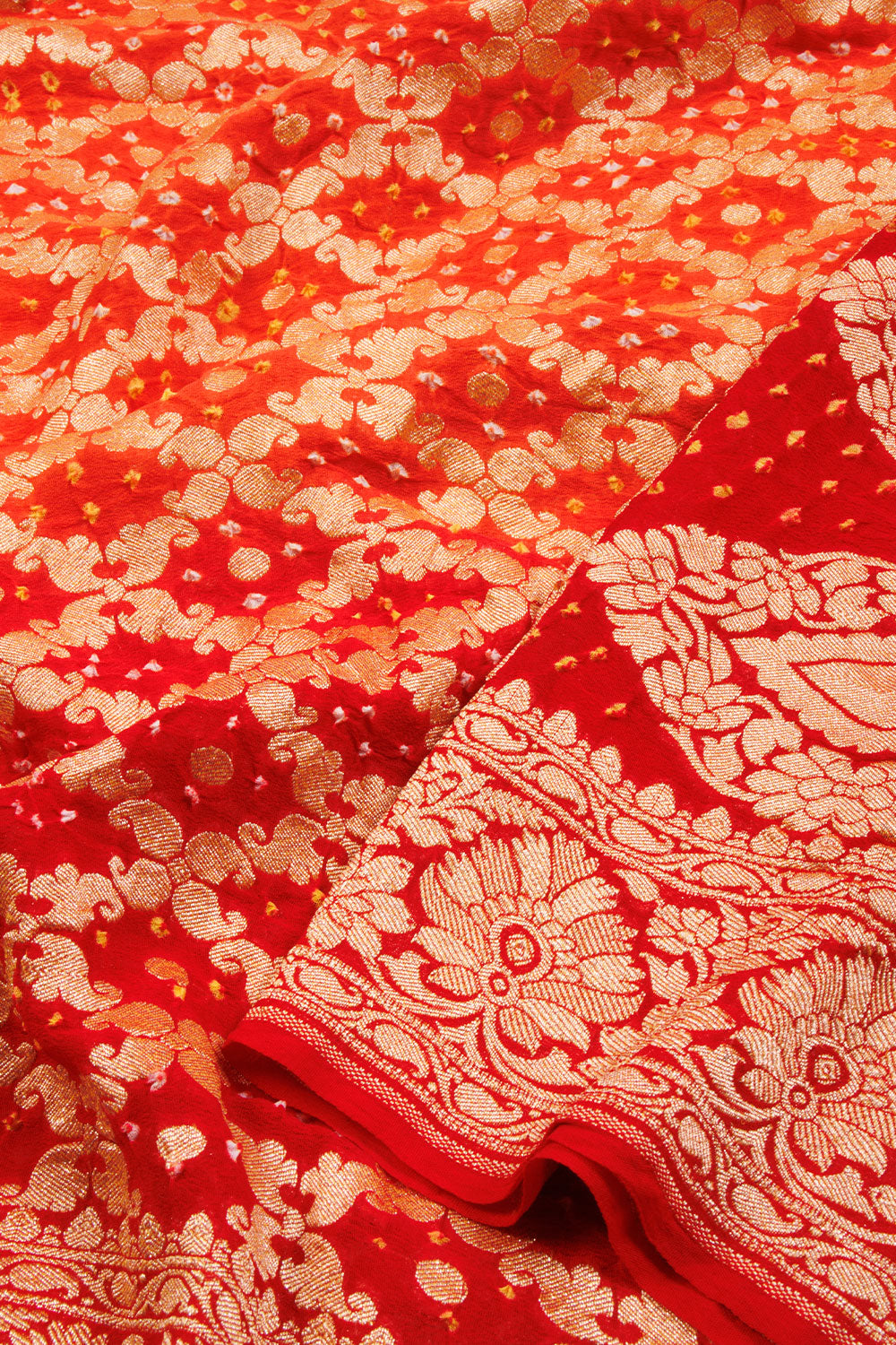 This handcrafted Brick Red Banarasi Bandhani Georgette saree features a stunning ombre dyed chilli red border. The intricately designed body boasts a beautiful Jaal pattern and delicate dana motifs. The border and pallu are ado...