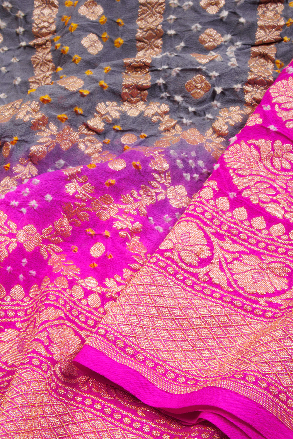 Experience the stunning contrast of the demure grey body and bold Rani Pink body and pallu in this exquisite Grey Handcrafted Banarasi Bandhani Georgette Saree. Adorned with a mesmerizing Jangla and multicolour dana design, and...