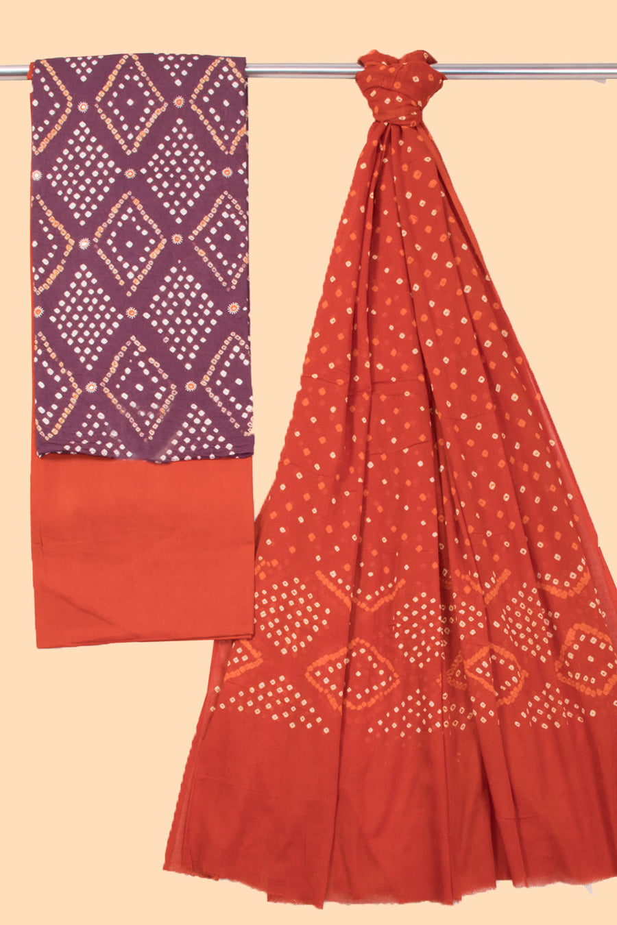 Peanut Brown with Purple Bandhani Cotton 3-Piece Salwar Suit Material This lightweight and breathable material is perfect for staying comfortable during hot summer days - ideal for any occasion you have in mind.