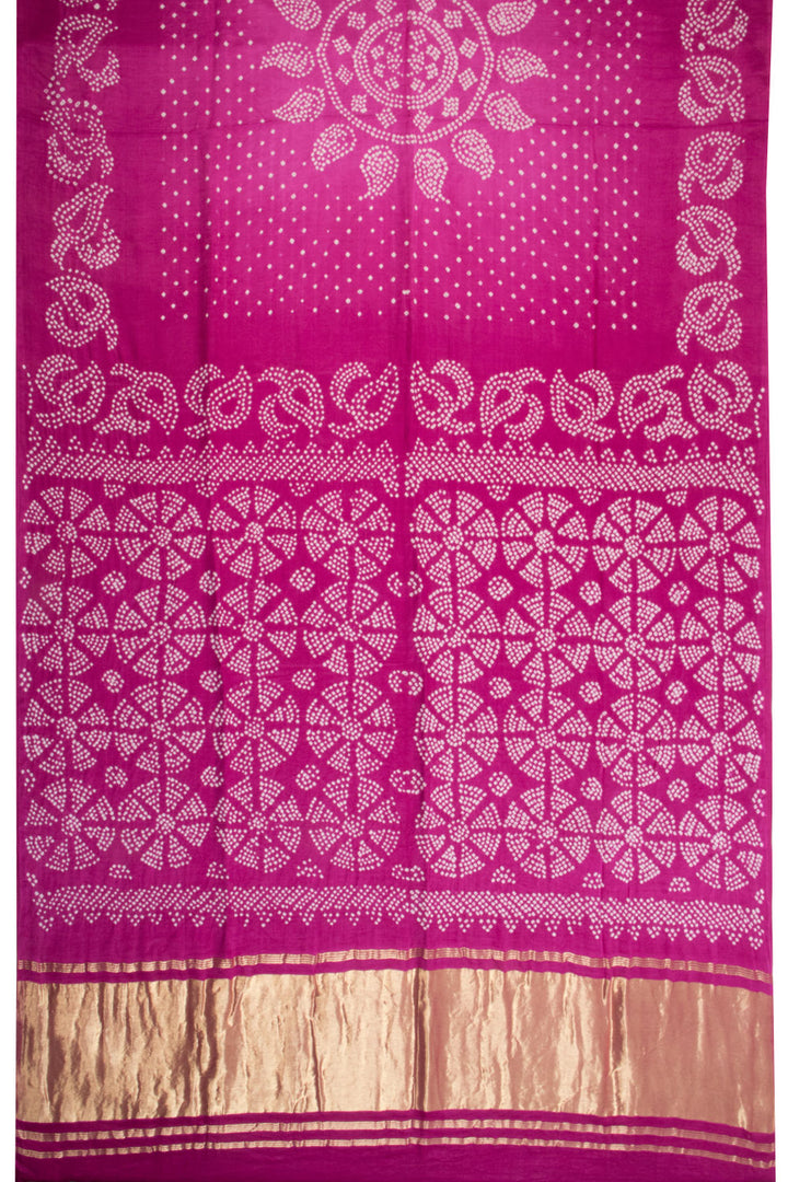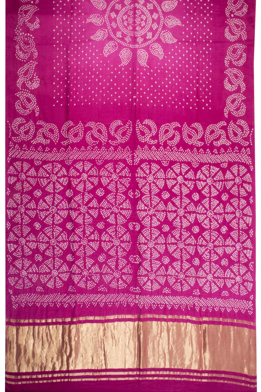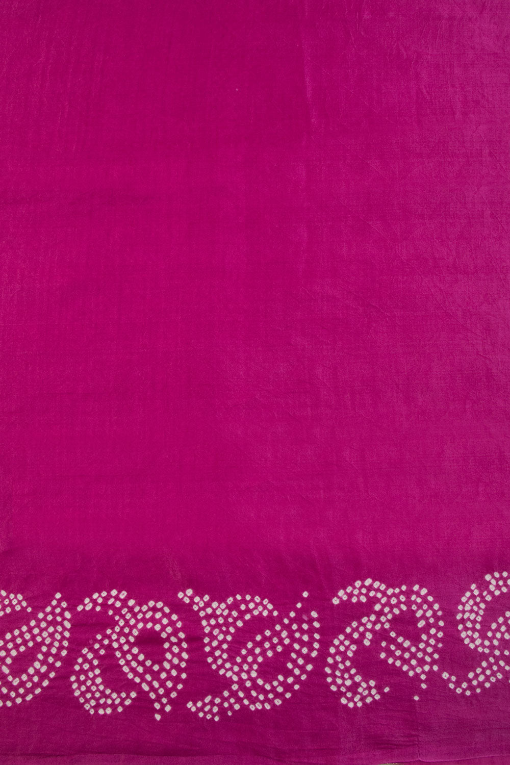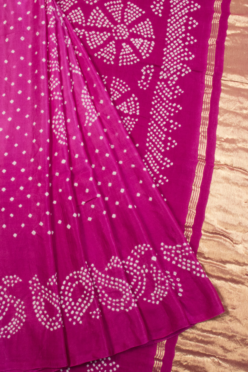 Indulge in the rich hues and intricate details of our mesmerizing Violet Handcrafted Bandhani Gajji Silk Saree. Adorned with a monotone Paisley Motif Border and a statement gulab dana motif in the body, this saree exudes pure elegance. The Lagdi Patti Tissue Pallu features alluring circular patterns, adding a touch of charm to this already stunning piece. Complete the look with the matching paisley border blouse and be ready to make a statement.