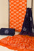This exquisite 3-piece Salwar Suit Material features lovely floral prints on the top in vibrant orange. The bottom is a dark blue batik-dyed fabric, while the chiffon dupatta adds a pop of blue and orange.