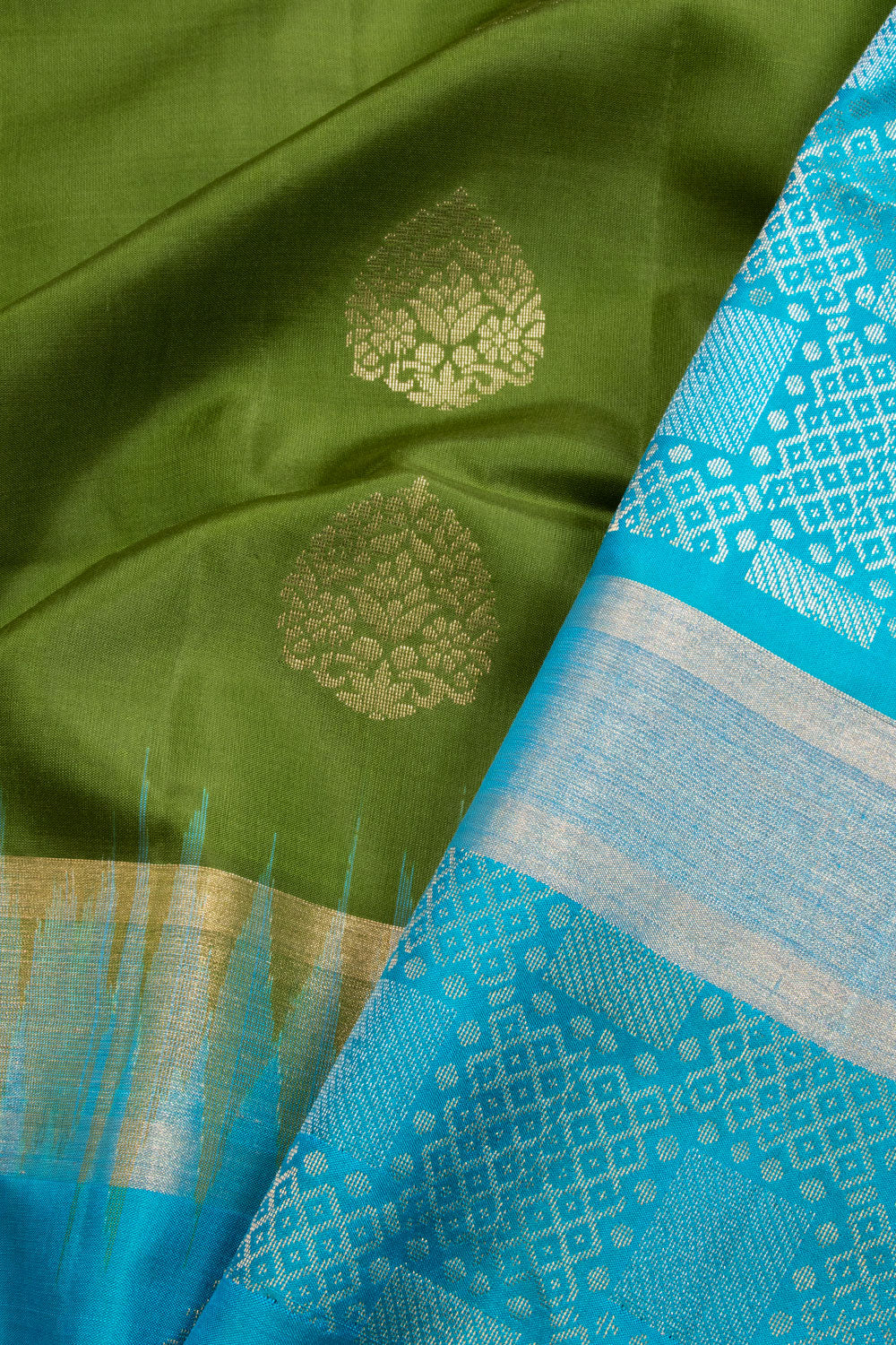 Experience the beauty and elegance of this Crocodile Green Handloom Kanjivaram Silk Saree adorned with a Nakashi Weave Kodimalar Design. The saree features a mesmerizing Peacock Butta Border and a vibrant chilli Red Pallu with ...