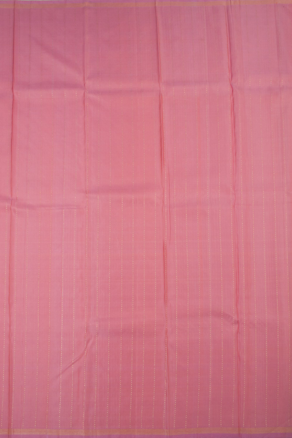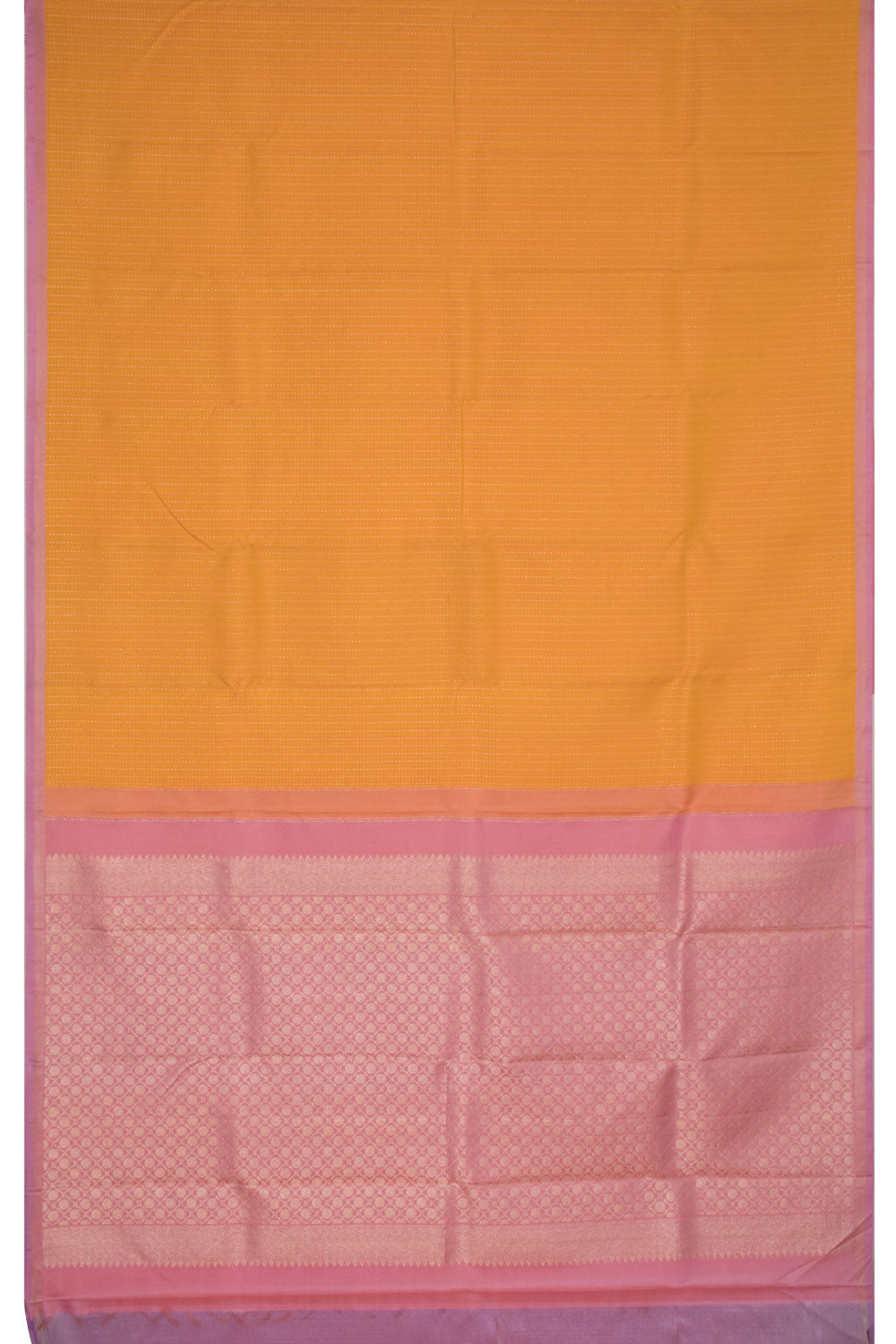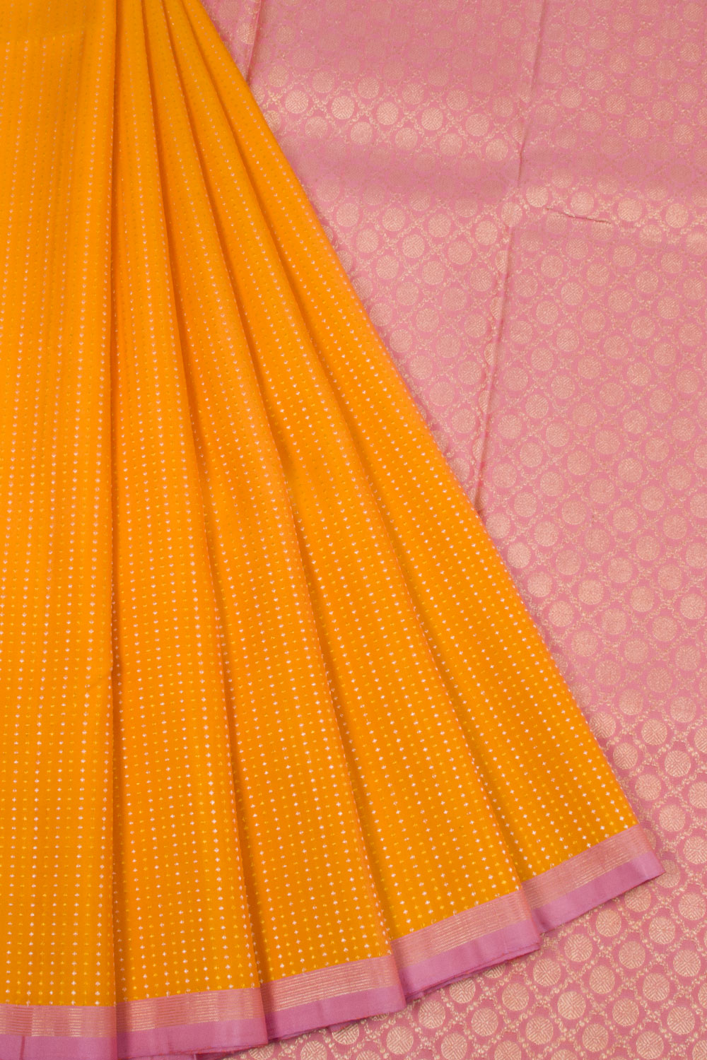 This Carrot Orange Pure Zari Kanjivaram Silk Saree is a classy pick, featuring zari dots across the body and a pink border of zari stripes with Diagonally set coin buttas on the pallu. A pink blouse with zari stripes is included, making it a perfect choice for day wear with its bright and cheerful colour contrast.