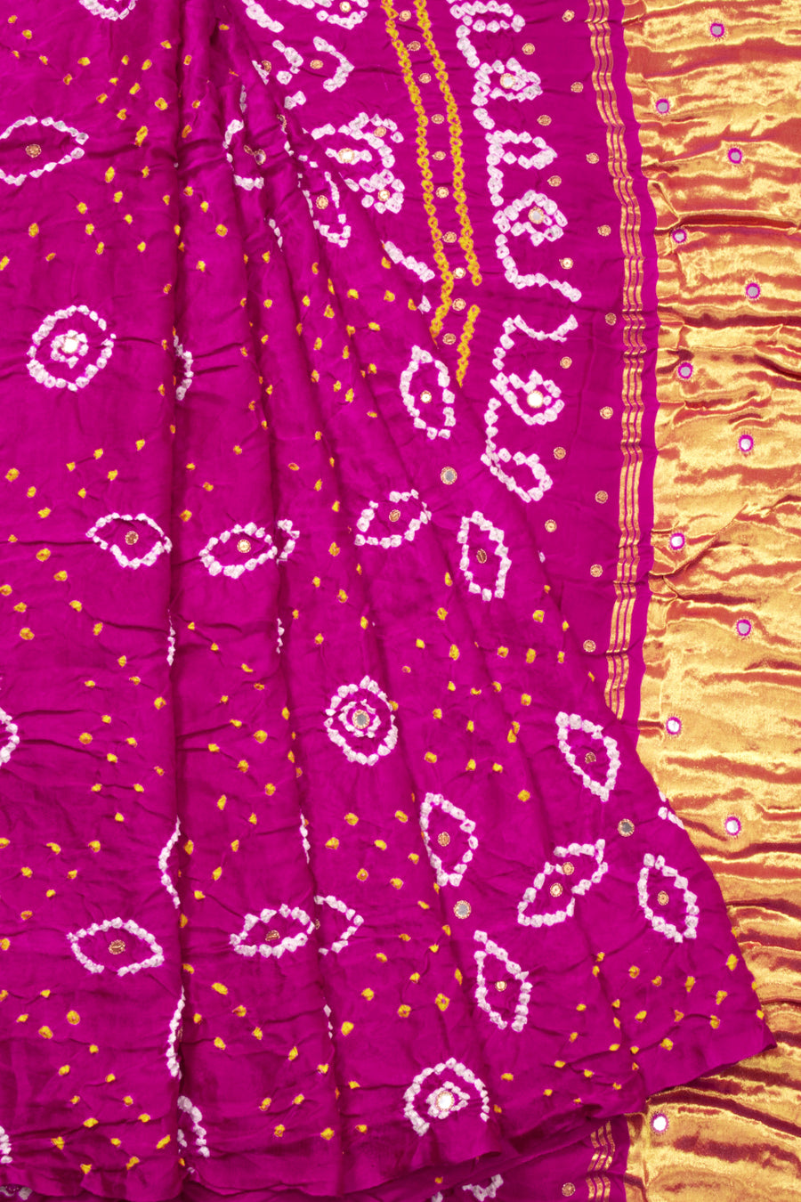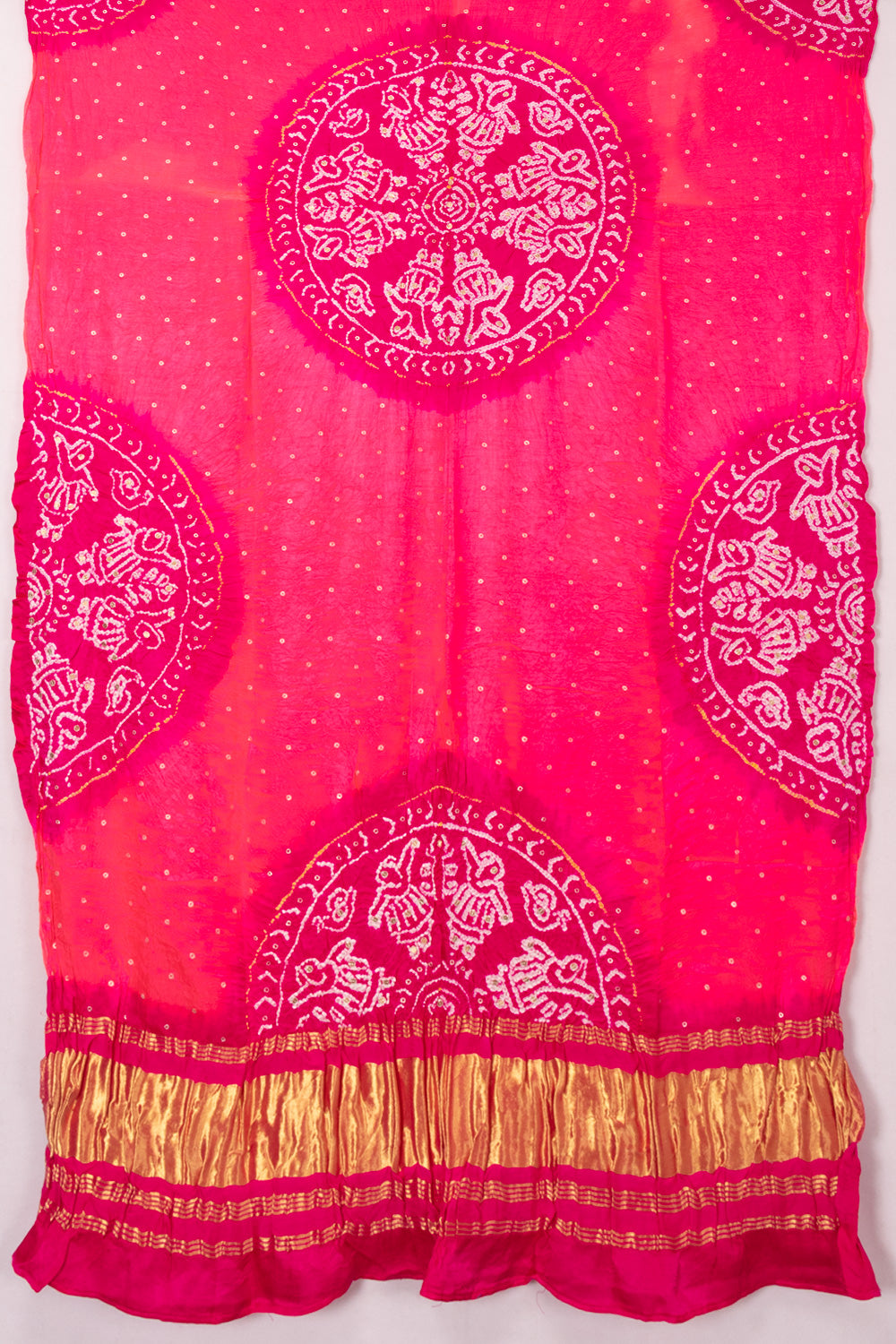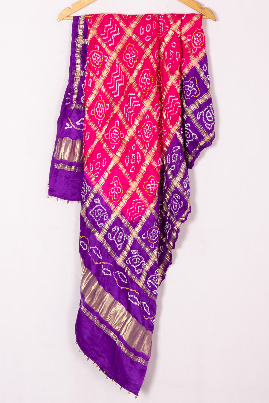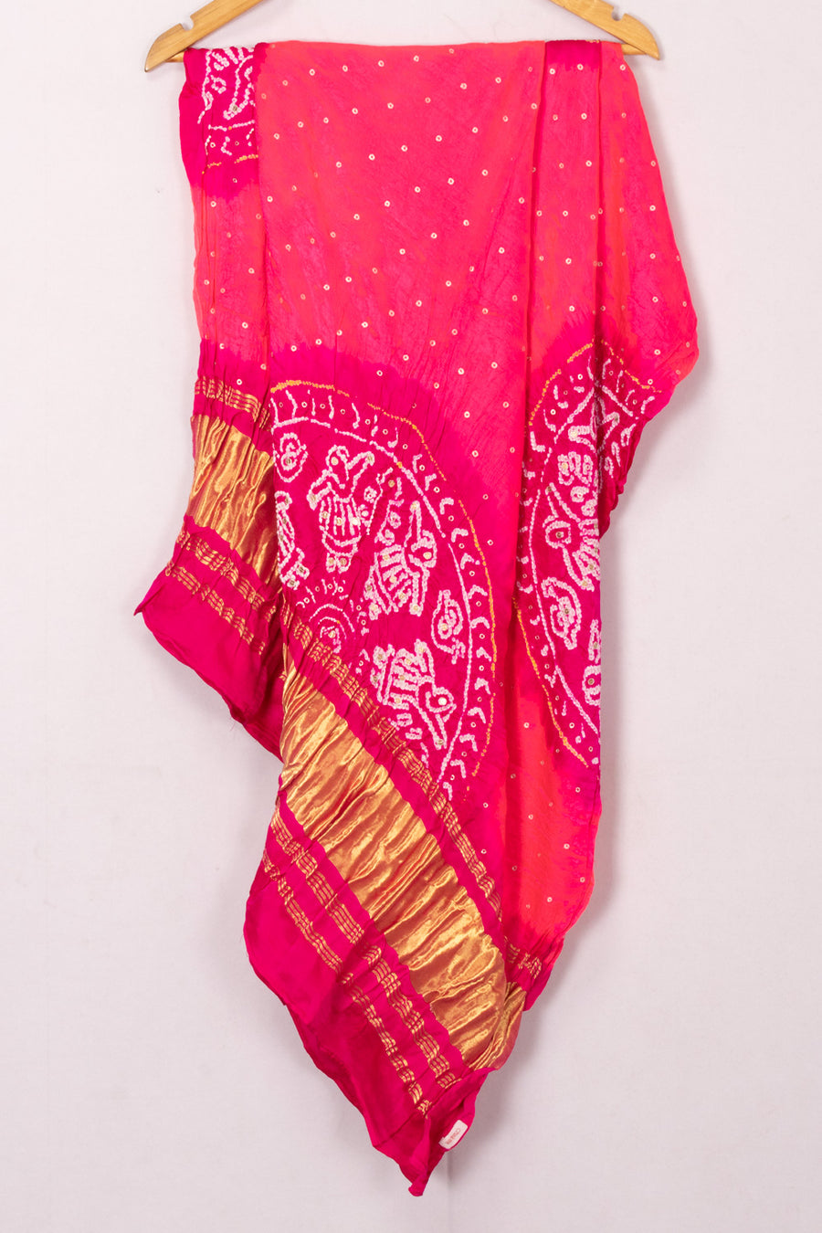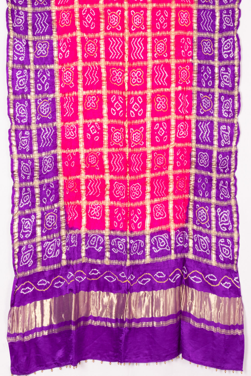 Unleash your vibrant side with our Pink Bandhani Gajji Silk Dupatta! The traditional Gaji Gharchola design is elevated with a contrast border and elegant beads edging. Perfect for adding a splash of color to any outfit.