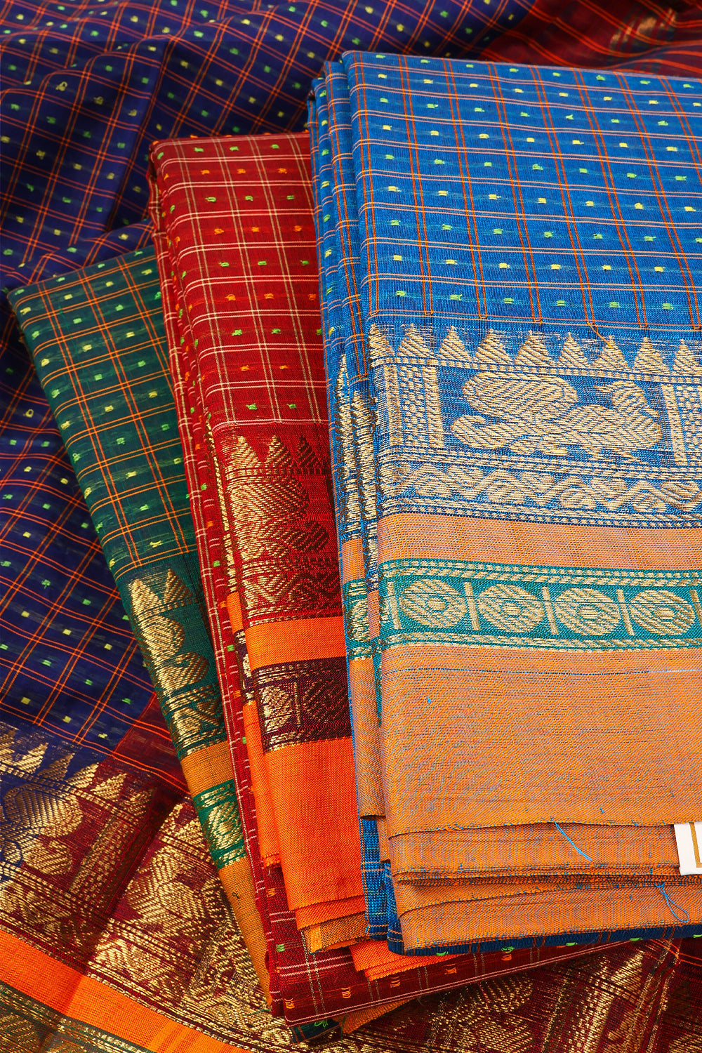- Bold Checks Sarees – Traditional designs featuring striking colour contrasts and large checks, a true Chettinad classic.