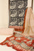 Transform your wardrobe with our Black Vanaspathi Printed Cotton 3-Piece Salwar Suit Material, featuring bold paisley prints on the top and a unique zig zag design on the cream bottom and dupatta. Made from high-quality fabric, this suit exudes sophistication and elegance. Complete the look with the brick red edging and floral palla on the dupatta. Elevate your style with this must-have piece!