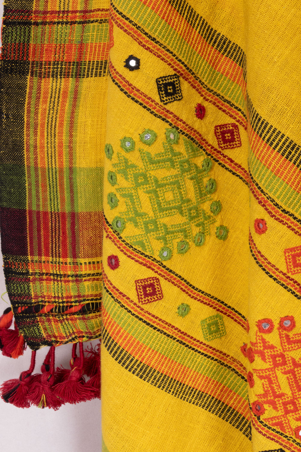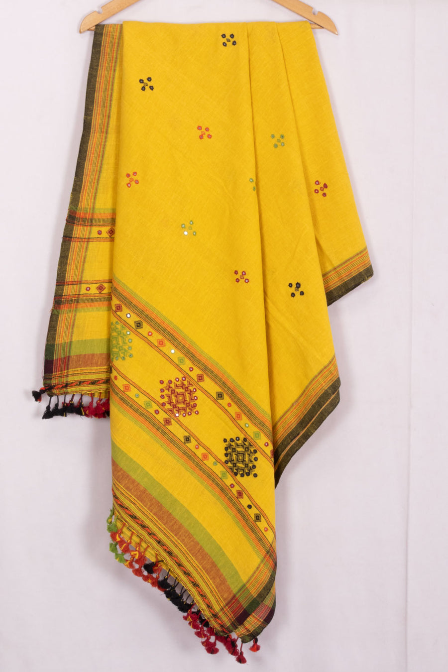 Add a pop of color to your wardrobe with this vibrant yellow Bhujodi Kala Cotton Dupatta! Made from 100% pure cotton, this dupatta not only looks beautiful but also feels soft and comfortable against your skin. Perfect for any ...