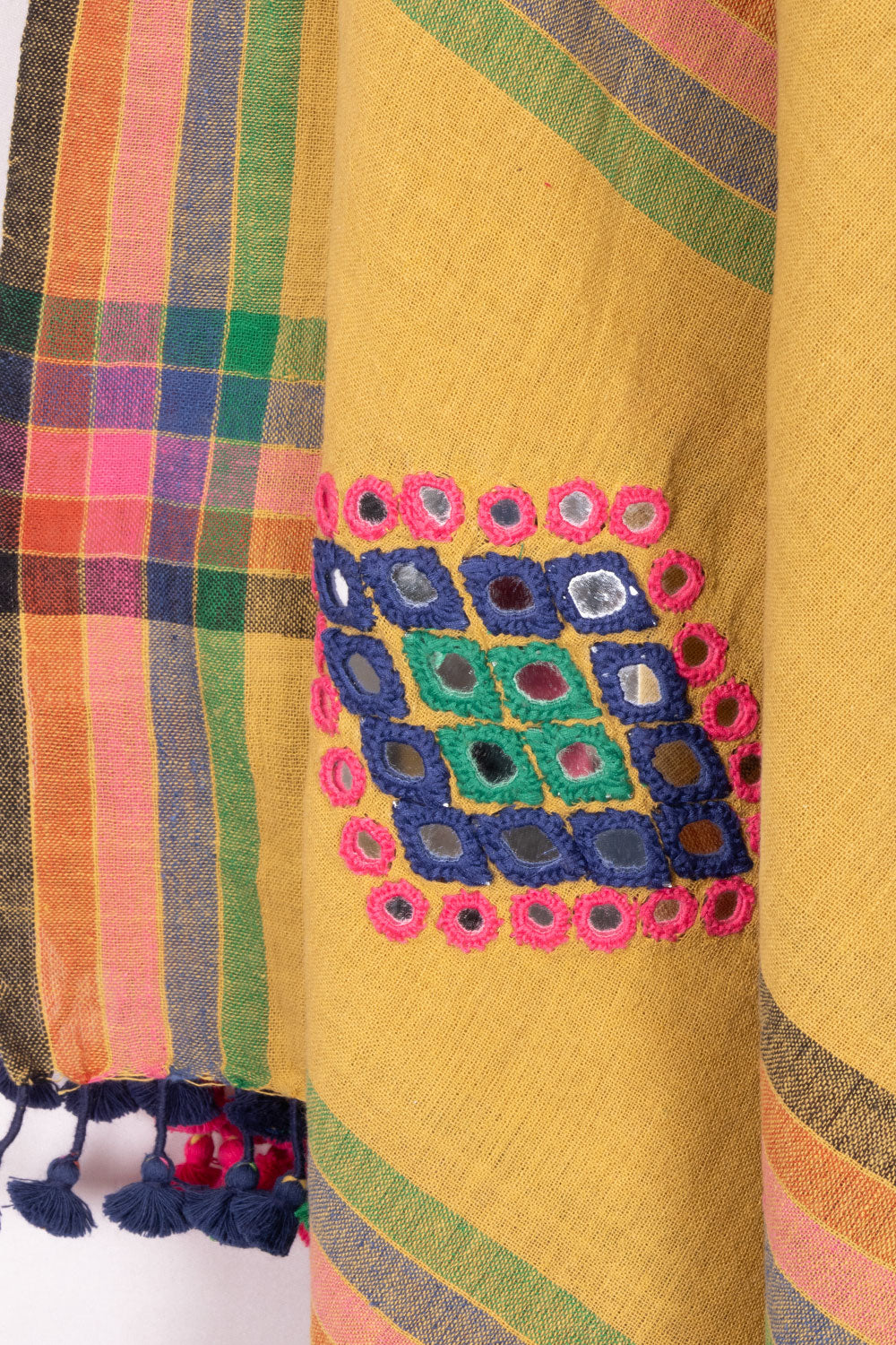 This Mustard Yellow Bhujodi Kala Cotton Dupatta is a stunning addition to any outfit. Handmade with traditional techniques, it features intricate embroidery and a vibrant color that will catch the eye. Made from 100% cotton, it...