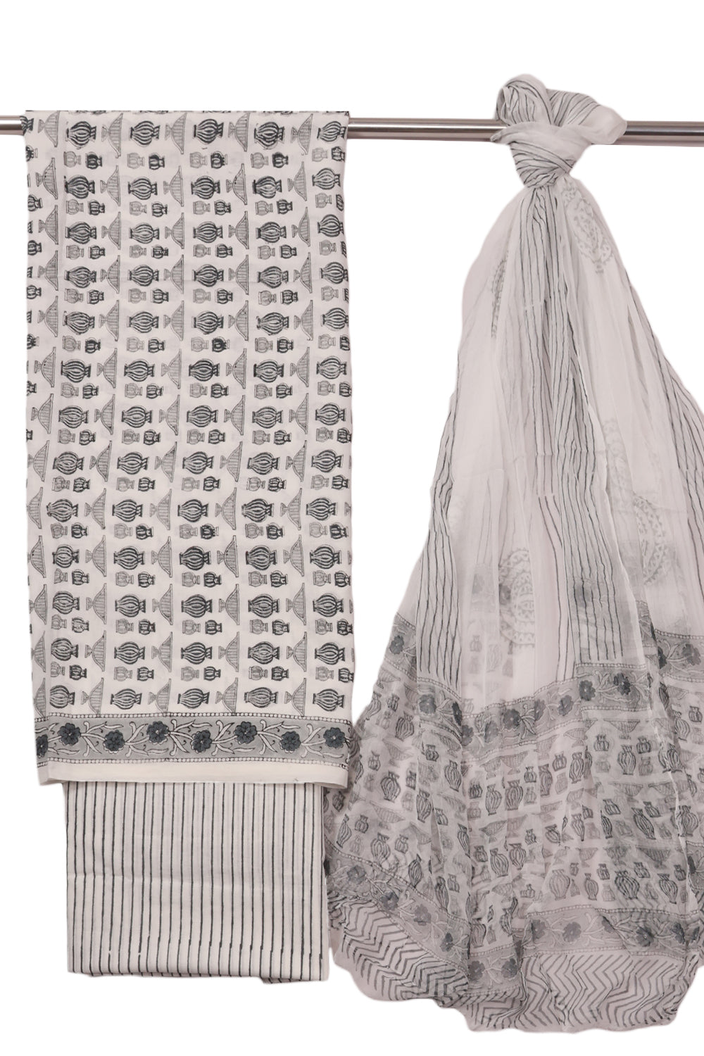 Bring a touch of elegance to your wardrobe with our stunning White Handblock Printed Cotton 3-Piece Salwar Suit Material. Made from high-quality cotton, this material features a beautiful hand block print in white, adding a unique touch to your traditional attire. Upgrade your style with this versatile and comfortable suit material.