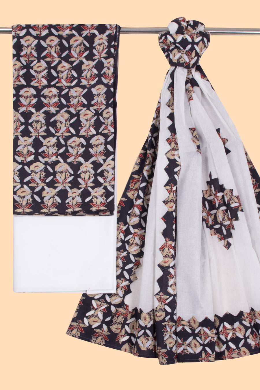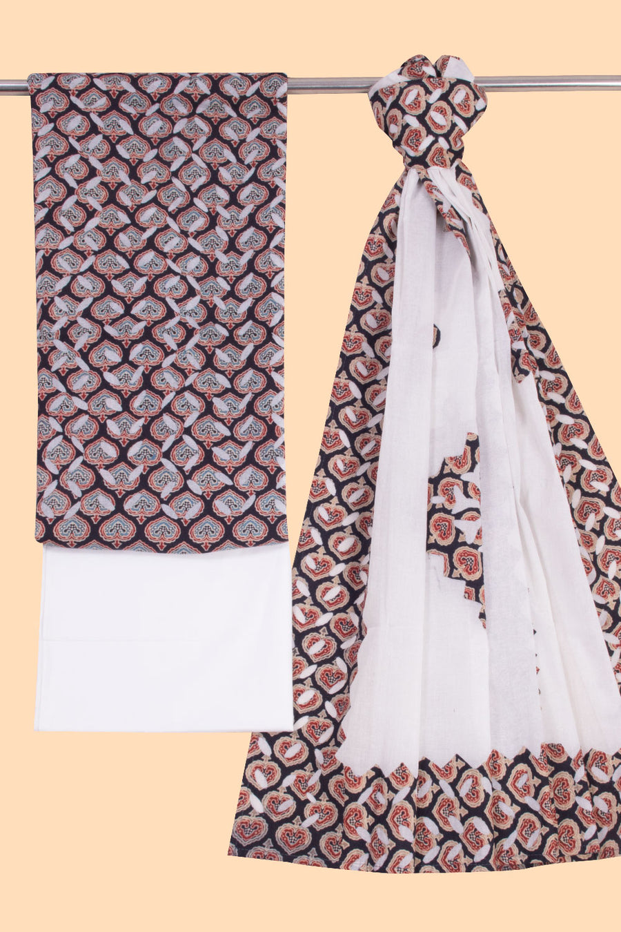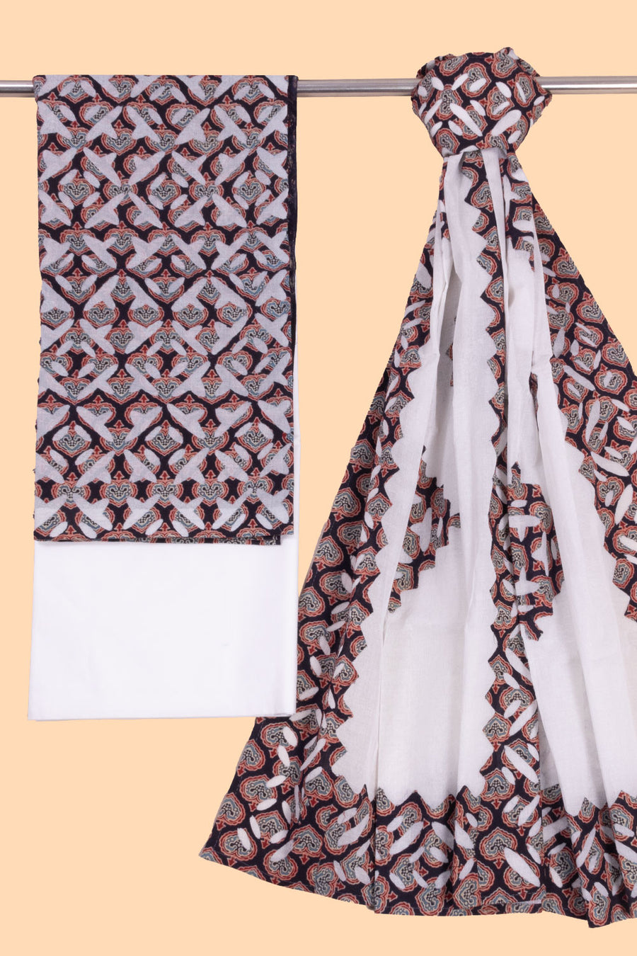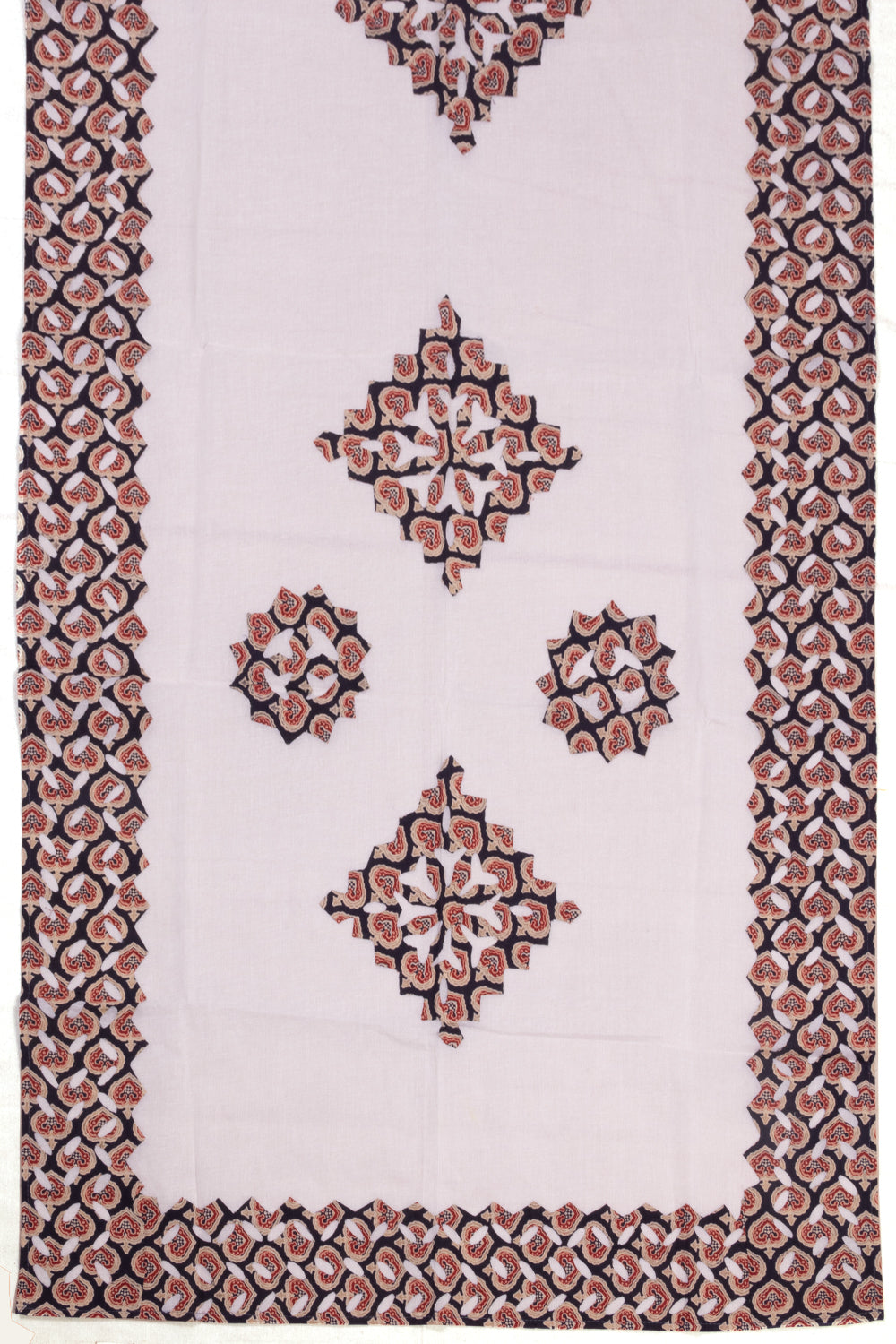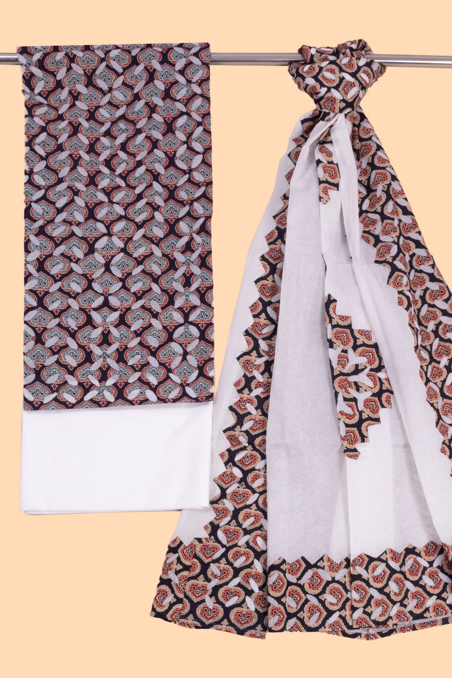 Indulge in the delicate beauty of our Black Ajrakh Printed Cutwork Applique Embroidered Cotton 3 Piece Salwar Suit Material. Made with the highest quality cotton, this suit material features intricate applique embroidery from B...