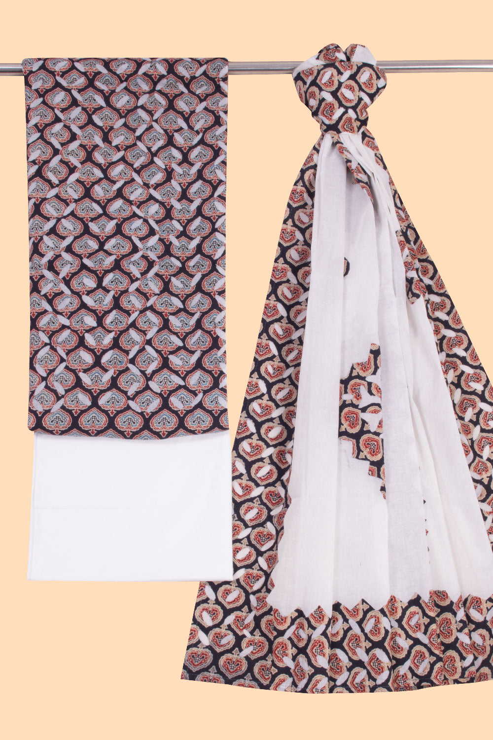 Indulge in the delicate beauty of our Black Ajrakh Printed Cutwork Applique Embroidered Cotton 3 Piece Salwar Suit Material. Made with the highest quality cotton, this suit material features intricate applique embroidery from Barmer, bringing a touch of traditional elegance to your wardrobe. Perfect for any occasion, this set is a must-have for those who appreciate exquisite craftsmanship and timeless style.