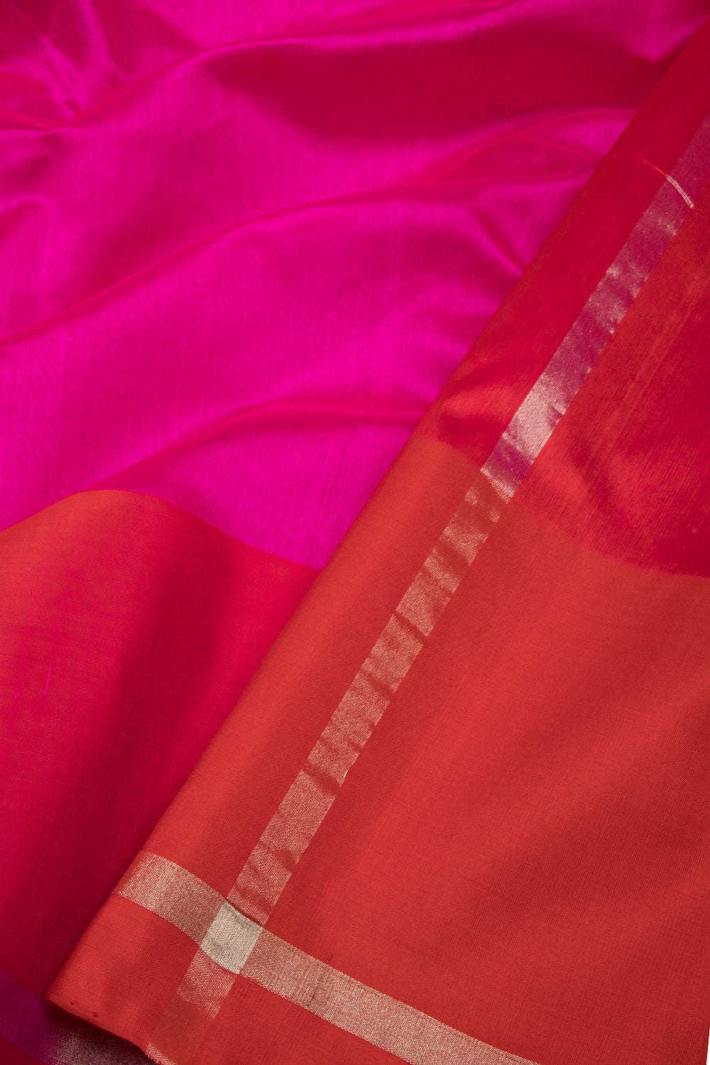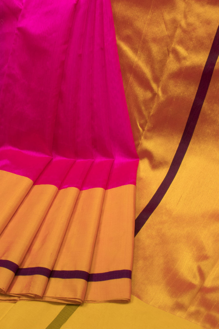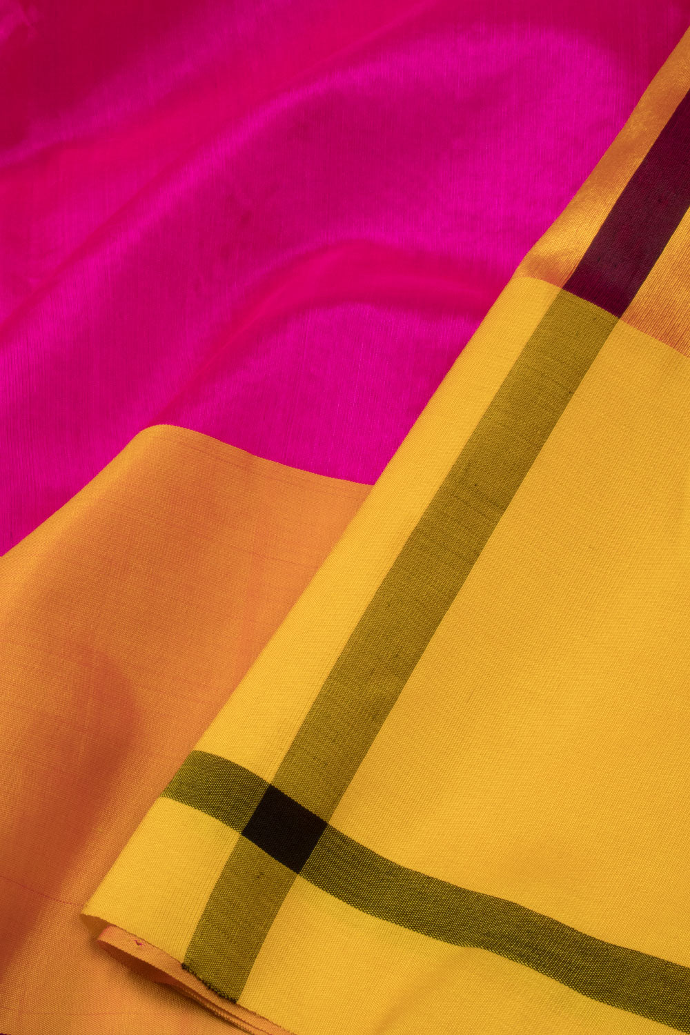 This Pink Handwoven Chanderi Silk Saree features a distinctive Mashru Border crafted with a unique three-shuttle loom technique. Its elegant gold pallu paired with a vibrant golden mustard blouse adds a striking contrast, makin...