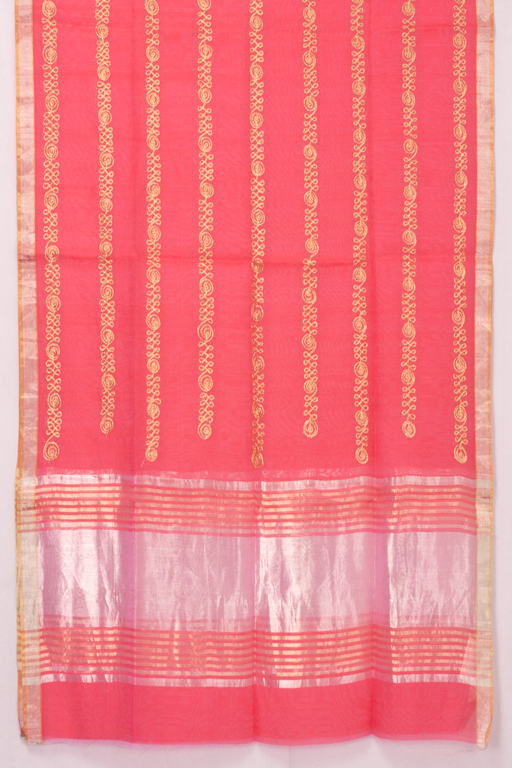 Spice up your wardrobe with our Pink Embroidery Silk Cotton Dupatta! This stunning dupatta features a pink mercerised body with tissue stripe pallu and intricate gold and silver zari work. The aari stripes embroidery adds an ex...