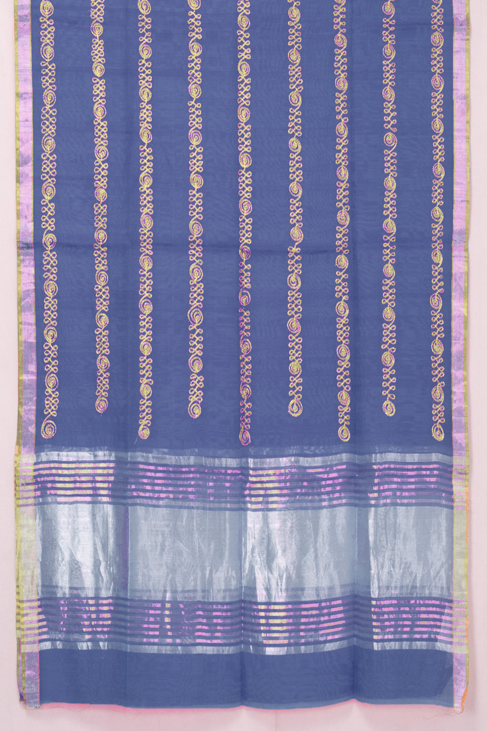 Spice up your wardrobe with our Blue Embroidery Silk Cotton Dupatta! This stunning dupatta features a pink mercerised body with tissue stripe pallu and intricate gold and silver zari work. The aari stripes embroidery adds an ex...
