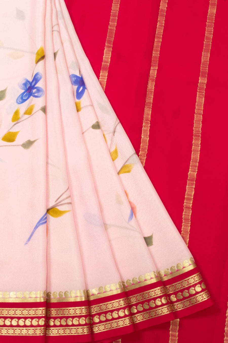 Elevate your style with the Baby Pink Hand Painted Mysore Crepe Silk Saree, a perfect blend of artistry and elegance. Crafted from luxurious Mysore silk with a smooth crepe texture, this saree features exquisite hand-painted de...