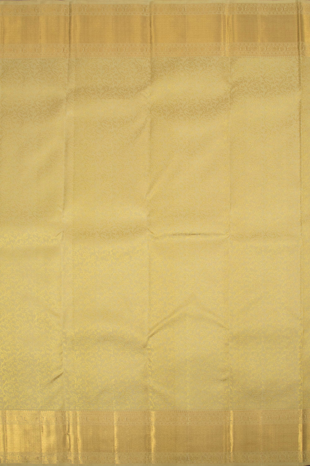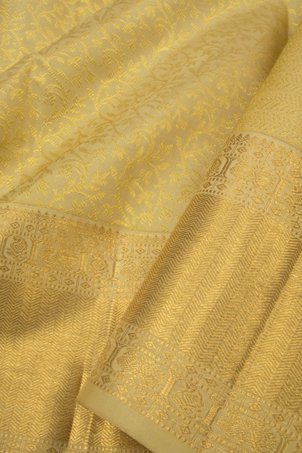 Embrace the mesmerizing beauty of this Metallic Gold Pure Zari Bridal Kanjivaram Silk Saree 10063061. Adorned with intricate floral vine motifs, this saree boasts a zari border on each side and a grand zari pallu. Complete the look with a matching blouse and elevate your style to new heights.