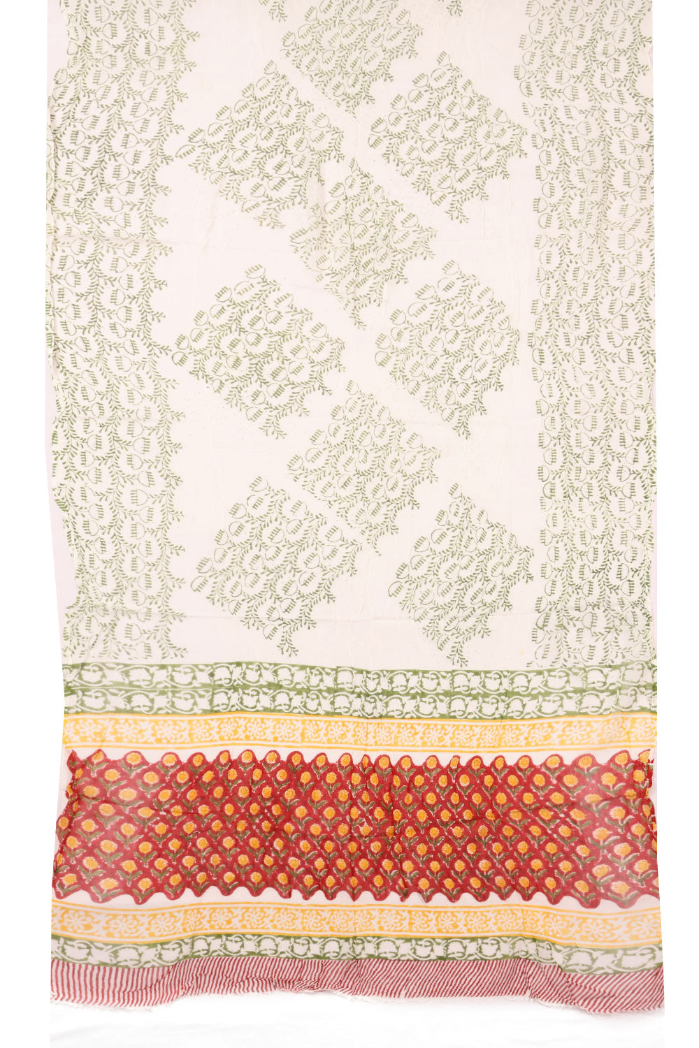 Experience the luxury and style of our Green Hand block Printed Cotton 3-Piece Salwar Suit Material. Made from high-quality cotton, this suit material features a unique hand-block print design that is both elegant and eye-catch...