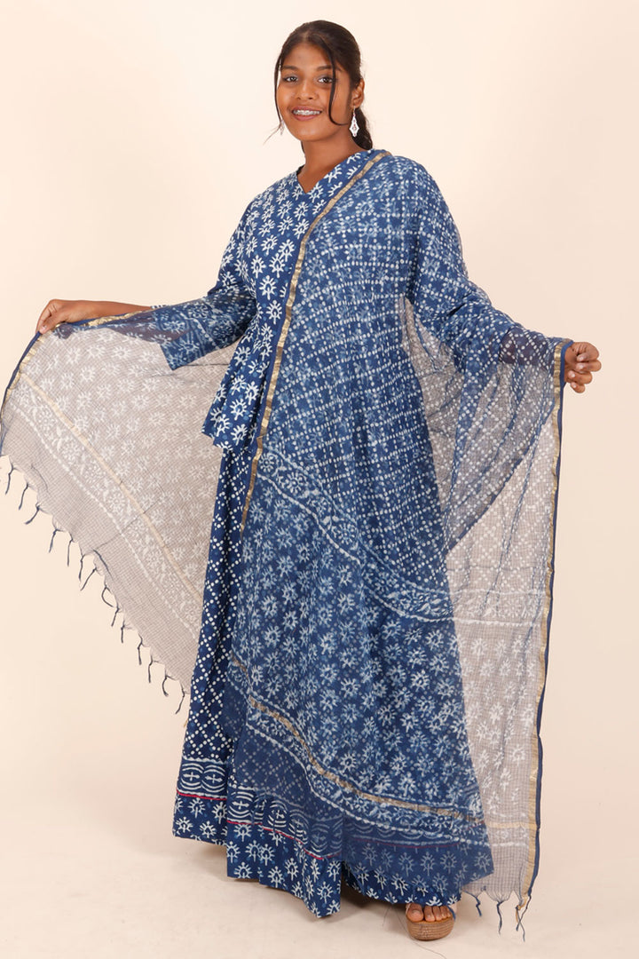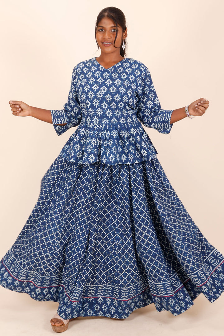Unleash your vibrant, confident style with our Blue Hand Block Printed Chaniya Choli! Made with soft, breathable fabric and adorned with intricate hand block prints, this versatile outfit is perfect for any occasion. Paired with a stunning Kota Doria Dupatta, get ready to turn heads and embrace your inner fashionista!