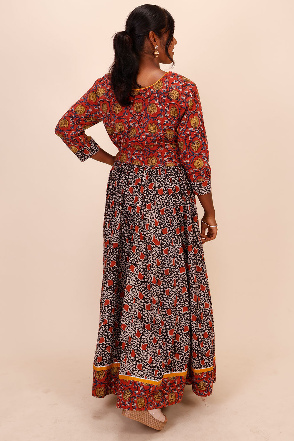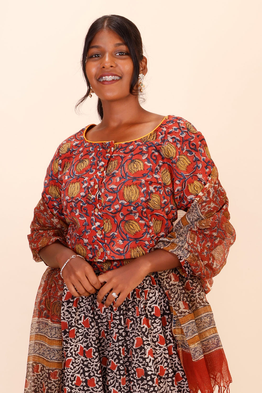 Revamp your wardrobe with our exquisite Maroon Hand Block Printed Cotton Chaniya Choli. The classic blend of Rustic Maroon and Black in this charming outfit makes it perfect for Navratri, Pujas, and other celebratory events. Mix and match the skirt, choli, and dupatta or wear them together for a stand-out look. Get this stunning set now and elevate your style game!