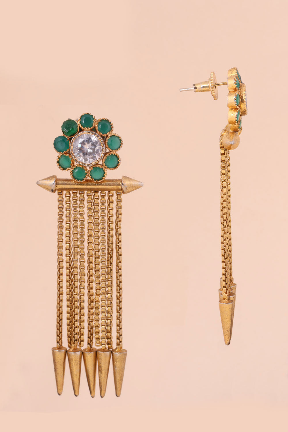 Enhance your style with these elegant gold plated chandbali earrings adorned with a delicate floral motif. Perfect for adding a touch of glamour to any outfit. Elevate your look and make a statement with these unique and eye-catching earrings. A must-have for any fashion-forward individual.