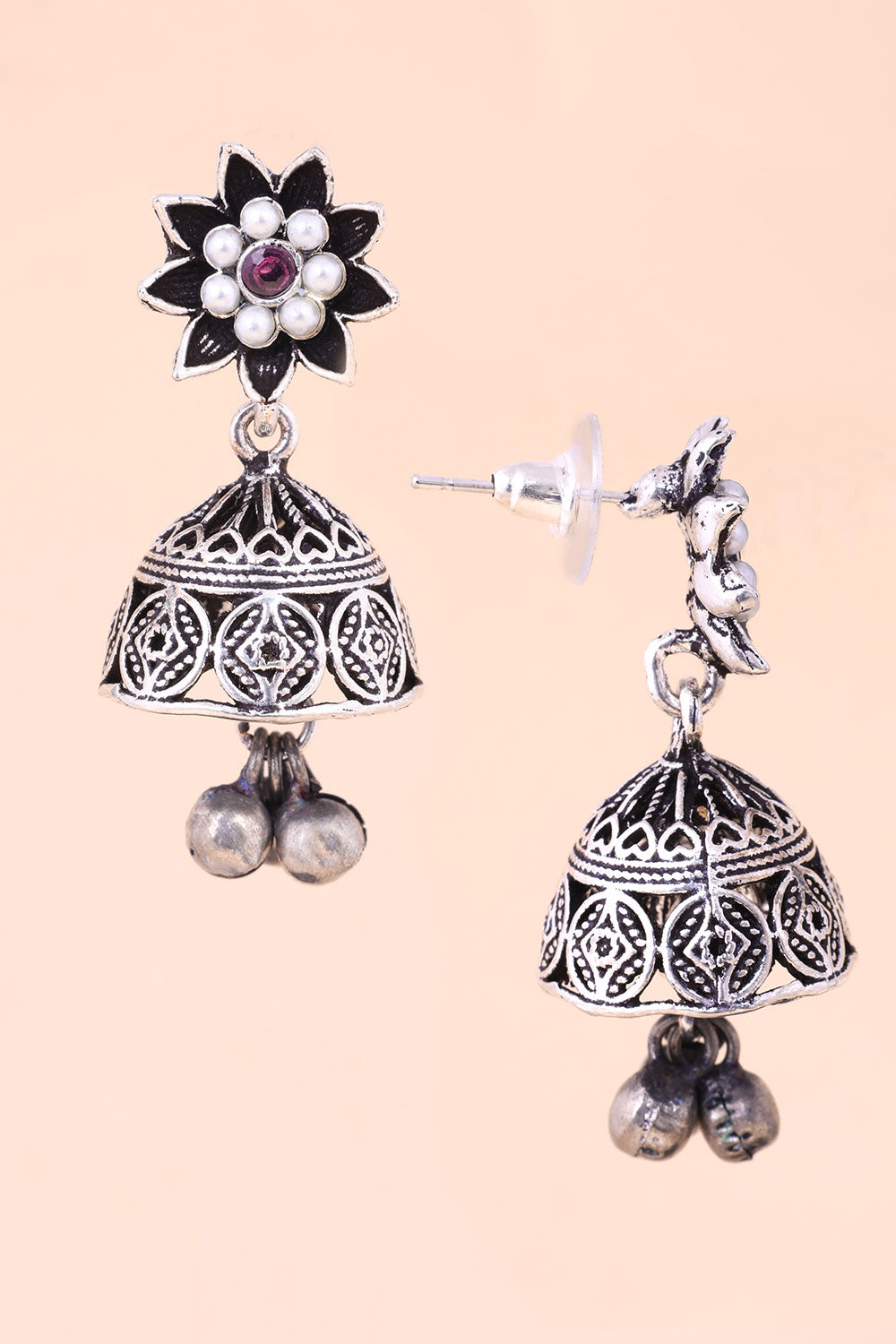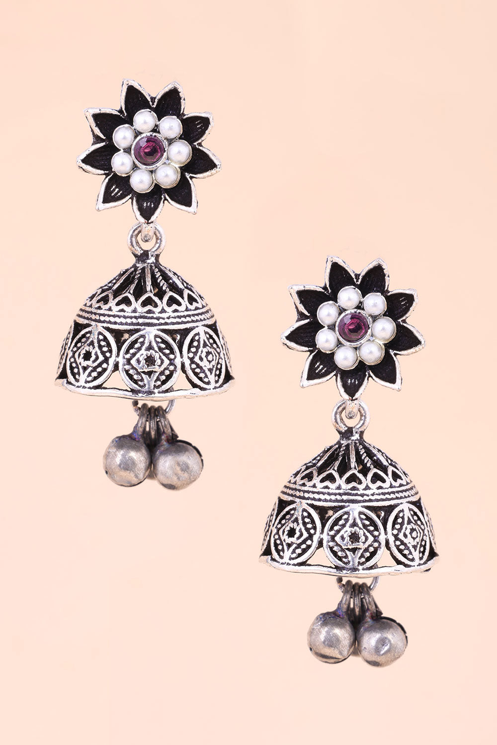 Add a touch of elegance to any outfit with our Oxidised Floral Earring featuring lustrous pearls. The unique oxidised finish adds a chic twist to the classic floral design. Perfect for any occasion, these earrings will make you stand out and feel confident!