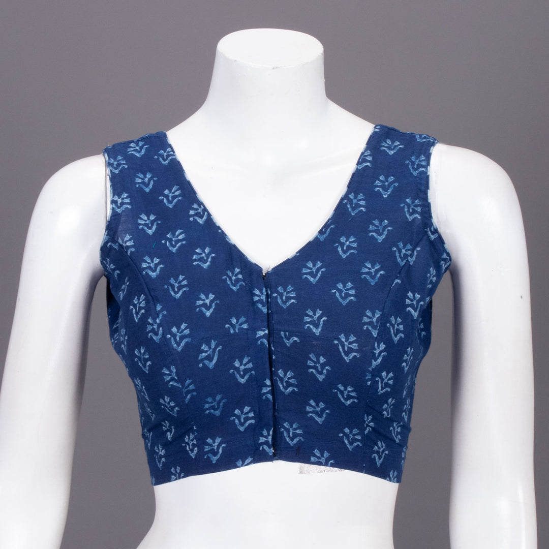 Blue Floral Motif Indigo Hand Block Print Cotton Blouse 10074578