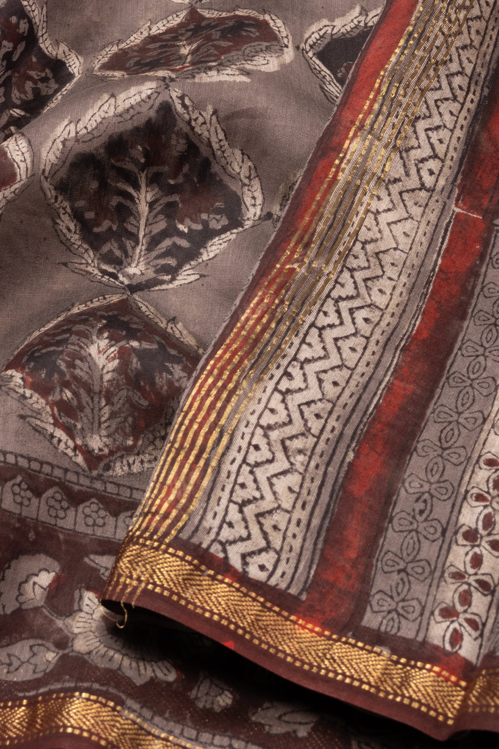Elevate your style with the Grey Jahota Printed Silk Cotton Saree. Made of luxurious silk cotton blend, this saree features a unique and intricate print that will make you stand out. Perfect for special occasions or to add a to...