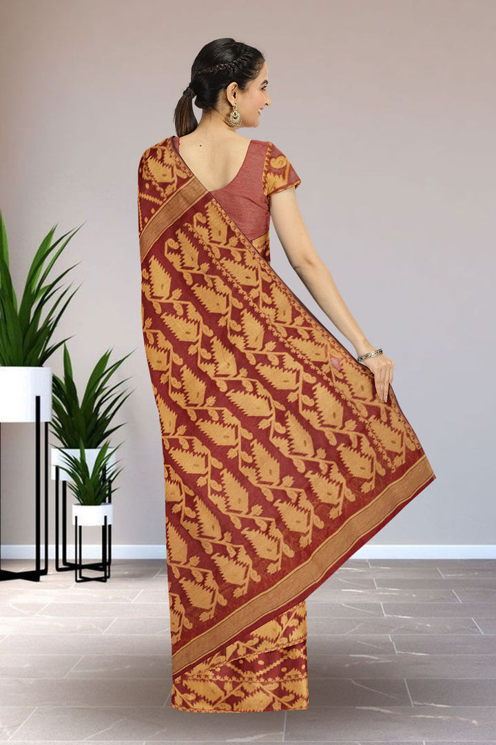 Avishya presents the Jamdani Style Cotton Saree, a delicate and artistic weave inspired by the celebrated Jamdani weaving tradition. Woven with intricate motifs that appear to float over a sheer, lightweight cotton base, this saree offers a graceful drape and all-day comfort. With its fine texture and detailed patterns, it is an ideal choice for both formal occasions and everyday wear.