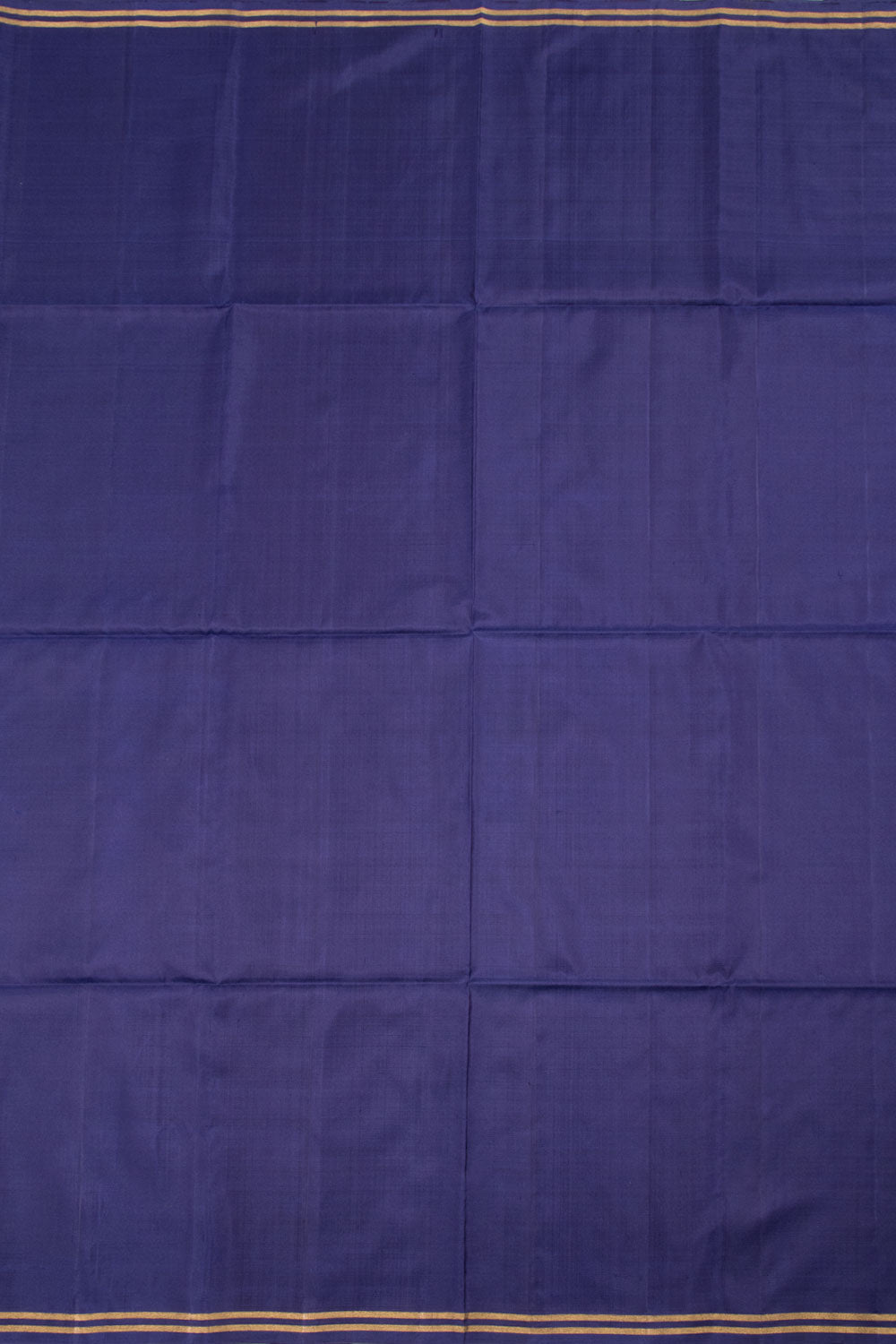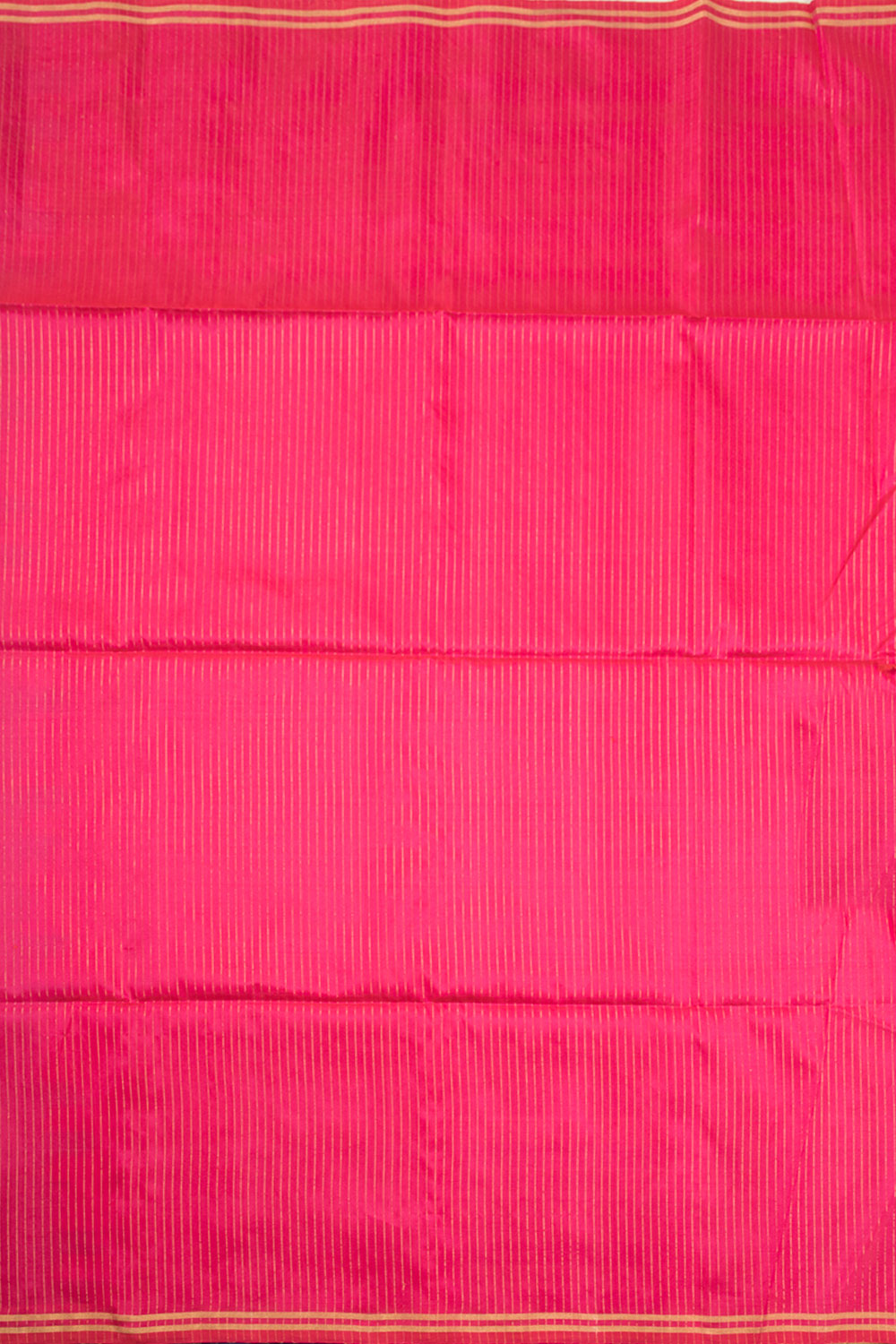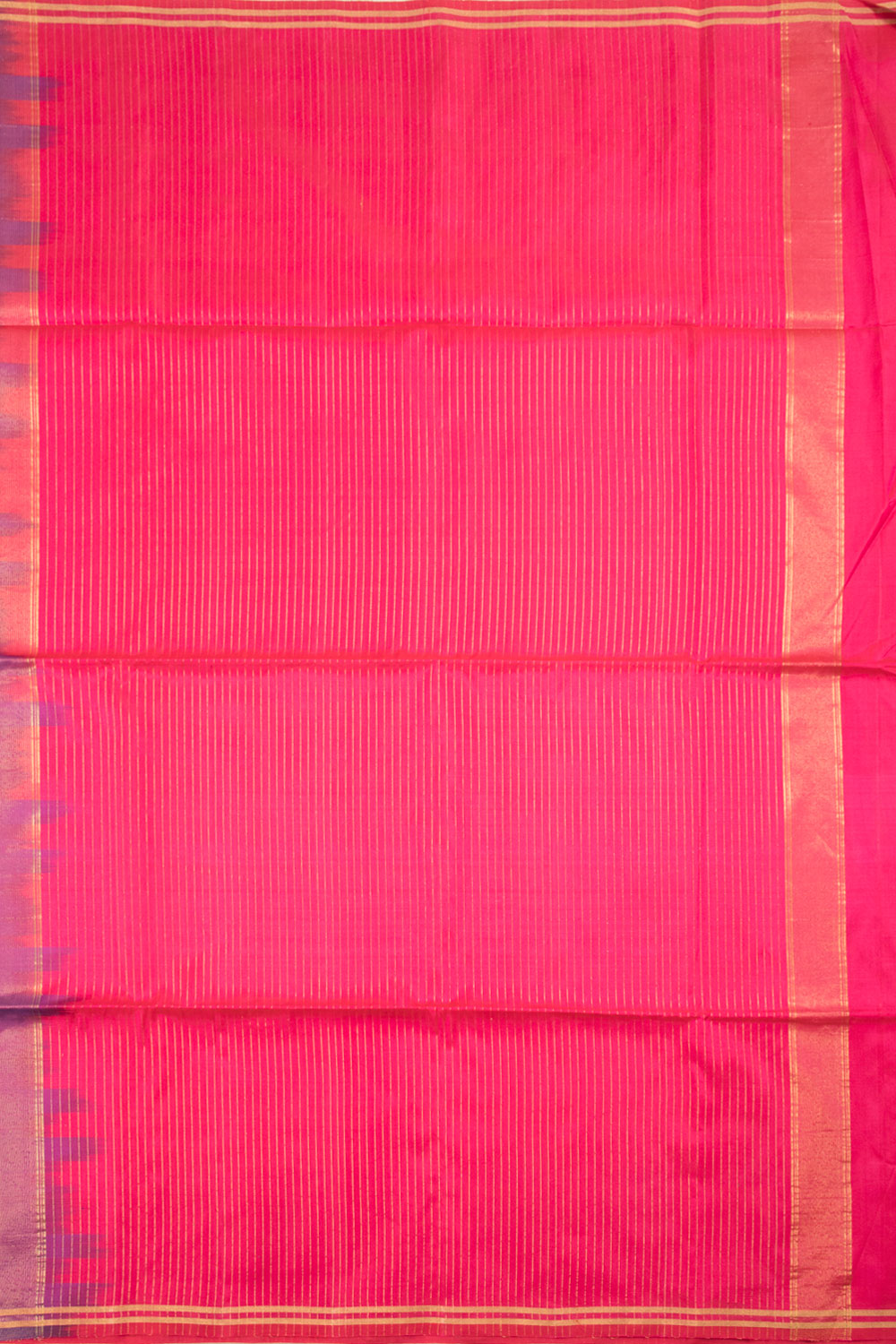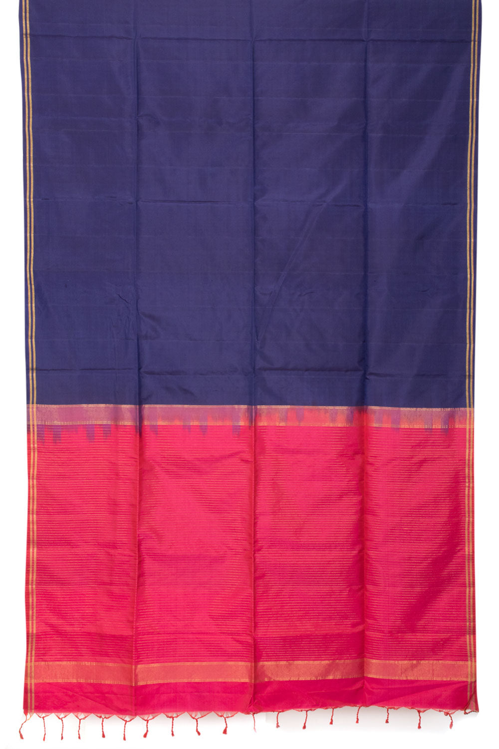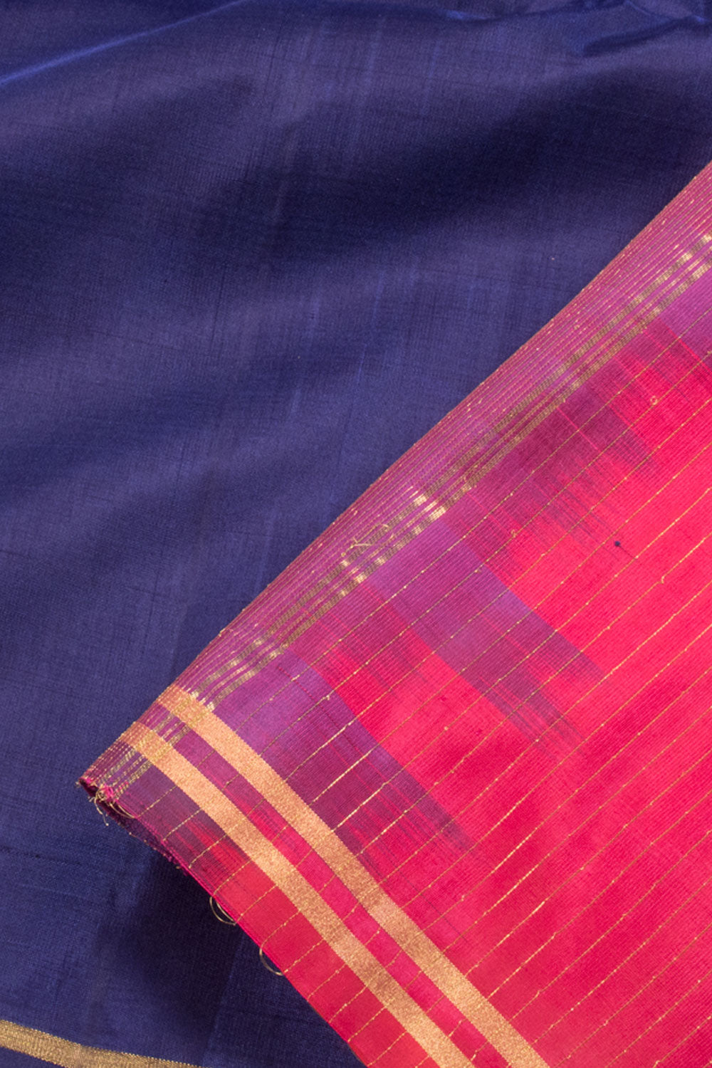 This Navy Blue Kanjivaram Soft Silk Saree is a stunning work of art. The saree features delicate zari borders on either side, complemented by a vibrant Magenta Pallu with stripes. The saree also includes a contrasting pink blouse to complete the look.