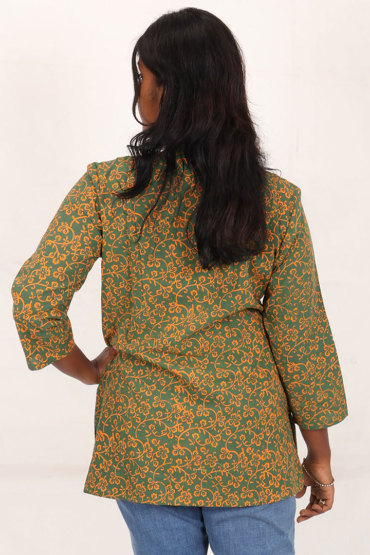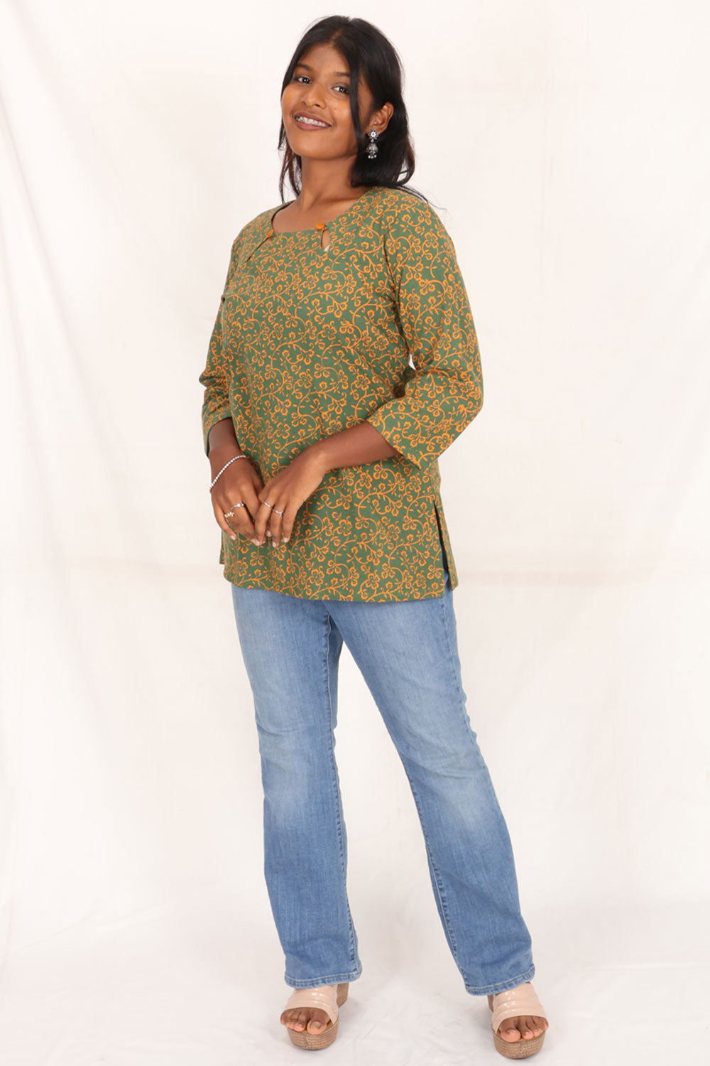 Experience vibrant elegance with this Green Hand Block Printed Cotton Kurti. Crafted from breathable cotton, it offers comfort and style for everyday wear. The intricate hand block prints add a unique, artisanal touch, making it perfect for casual outings or festive occasions. Embrace tradition with a modern flair and elevate your wardrobe effortlessly.