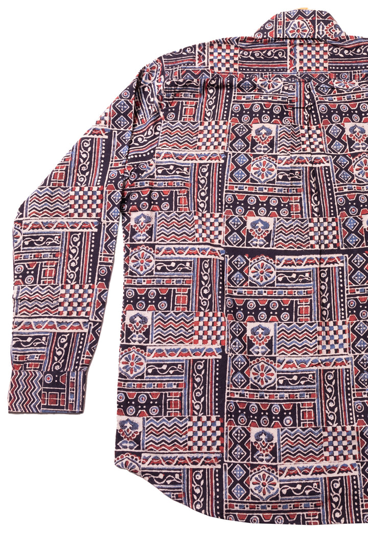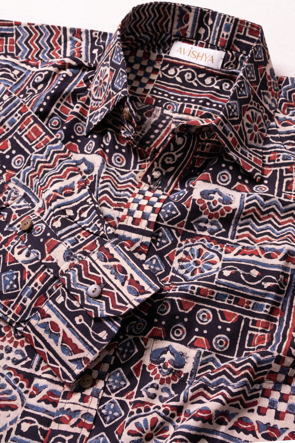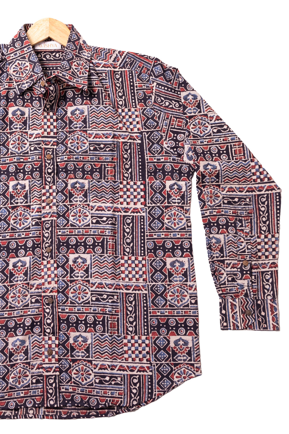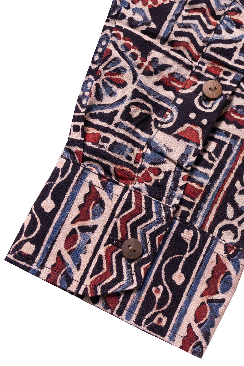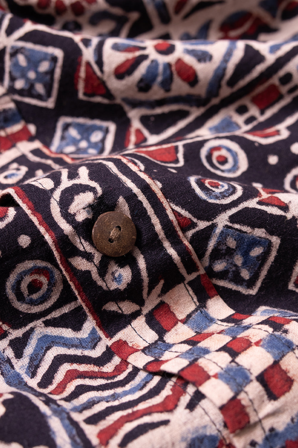 Experience the perfect blend of tradition and style with this Black Ajrakh printed cotton shirt. Crafted using natural dyes and featuring authentic wooden buttons, it ensures comfort and sustainability. Easily pair it with jeans, khaki pants, or shorts to create a versatile, eye-catching outfit that highlights your unique fashion sense.