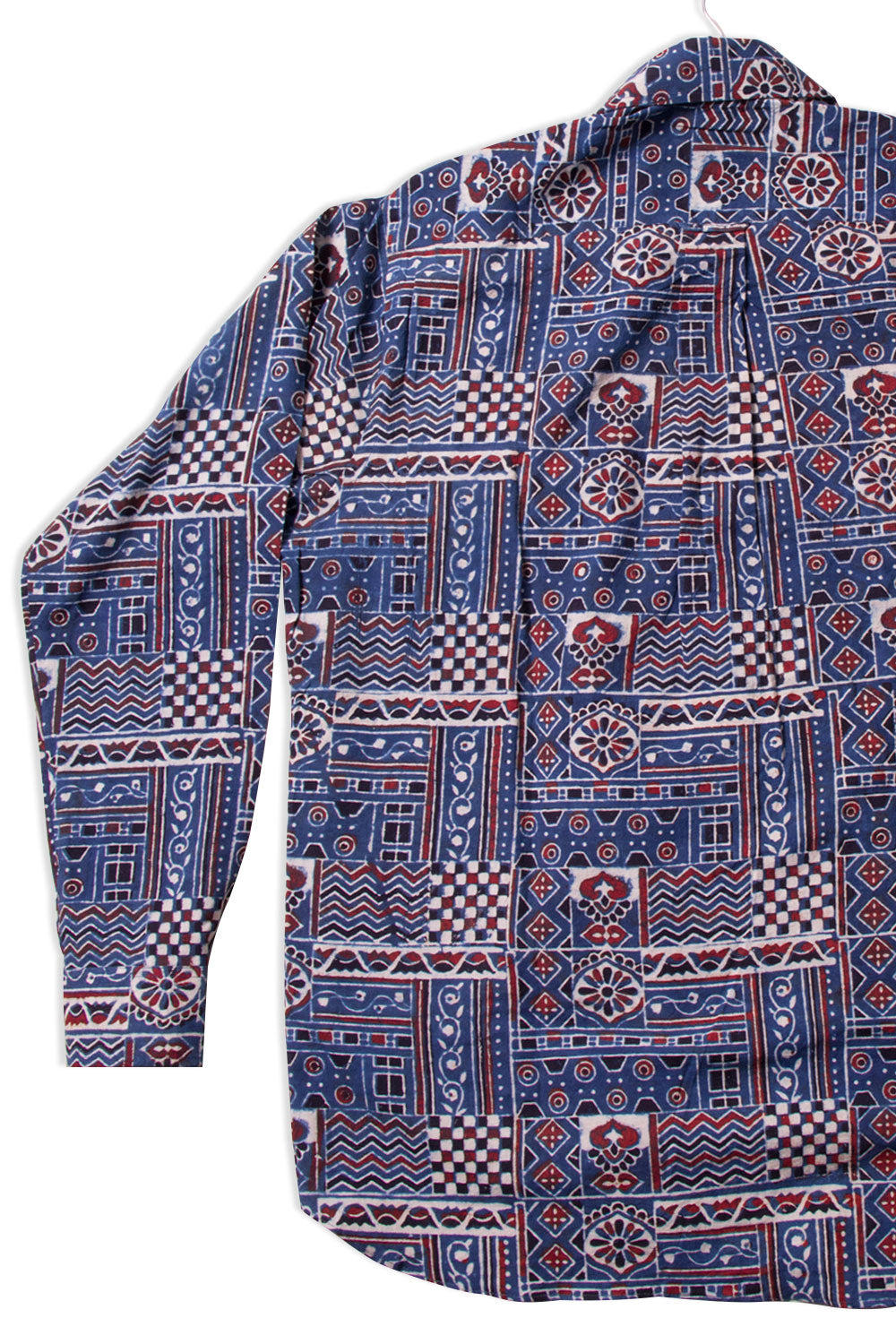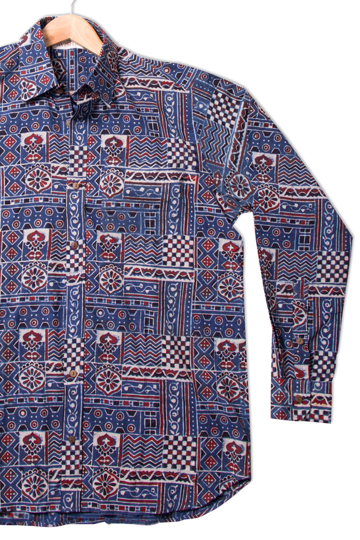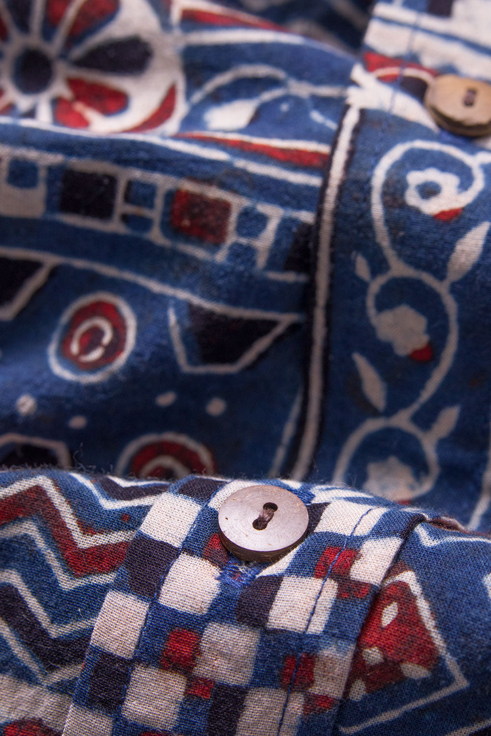 Experience the perfect blend of tradition and style with this Blue Ajrakh printed cotton shirt. Crafted using natural dyes and featuring authentic wooden buttons, it ensures comfort and sustainability. Easily pair it with jeans, khaki pants, or shorts to create a versatile, eye-catching outfit that highlights your unique fashion sense.
