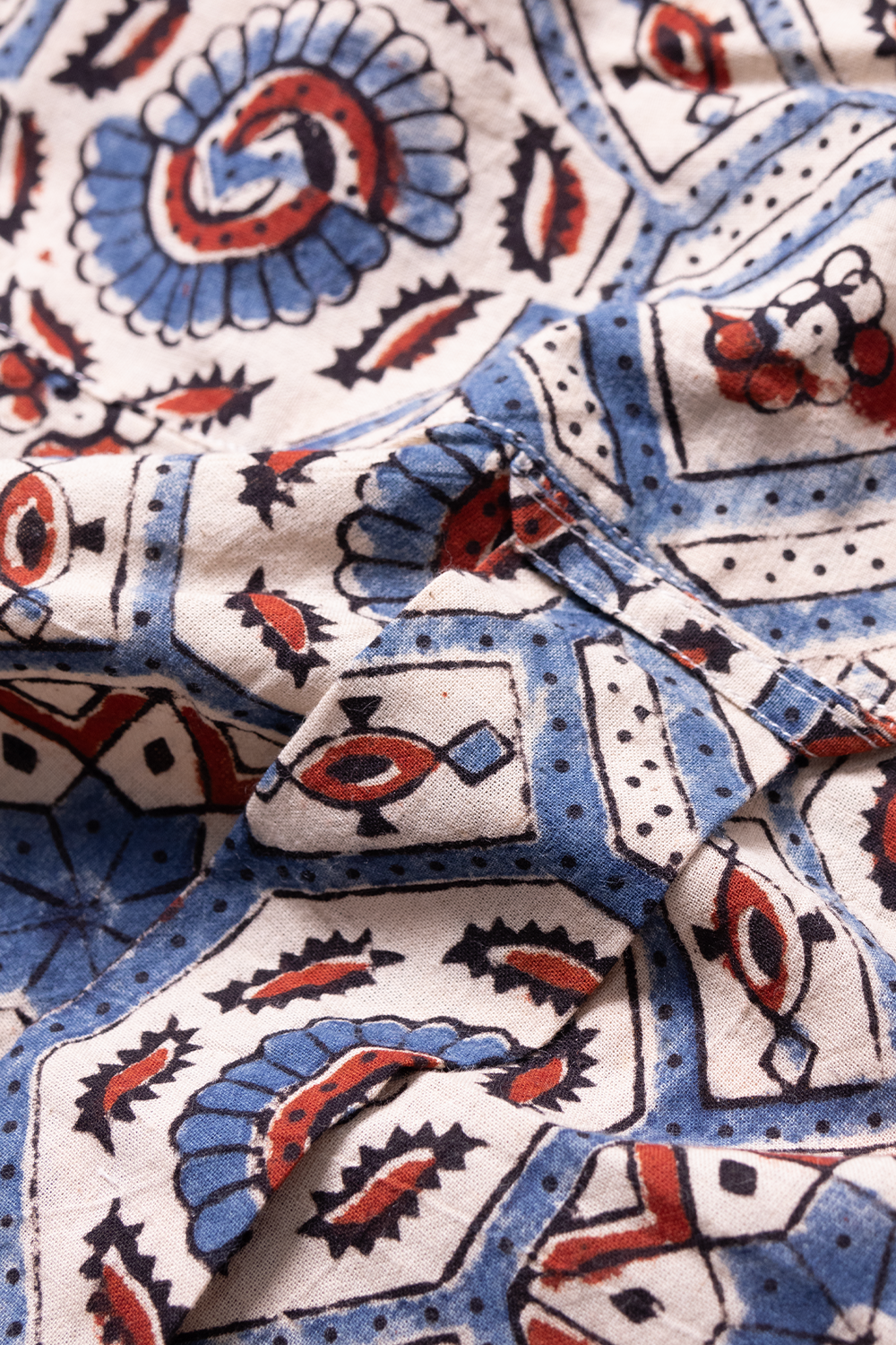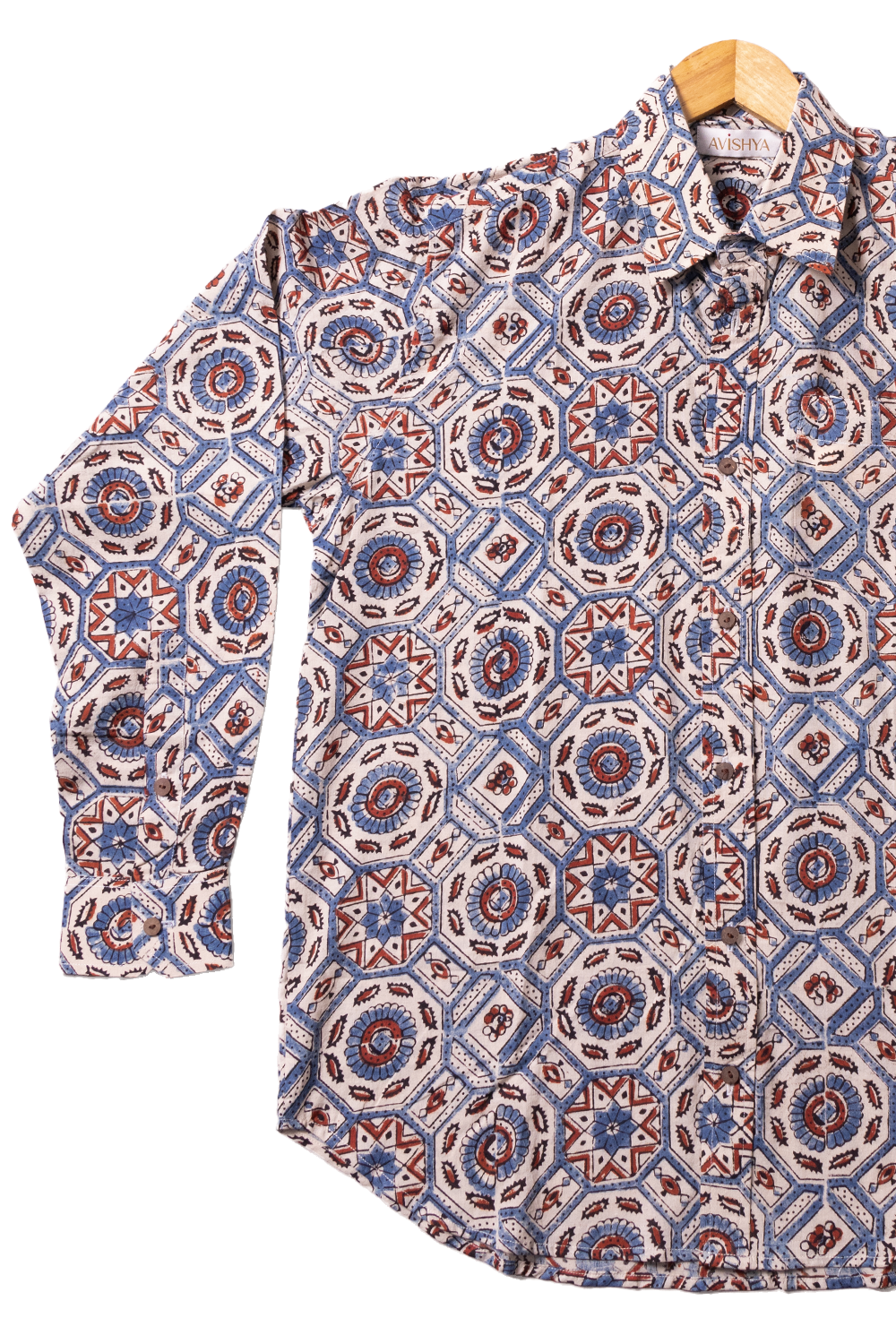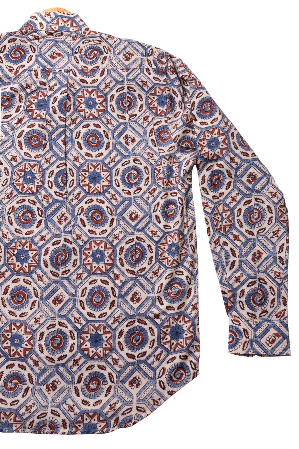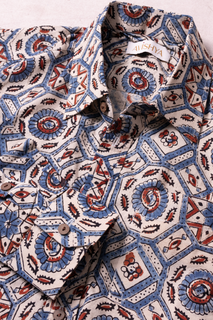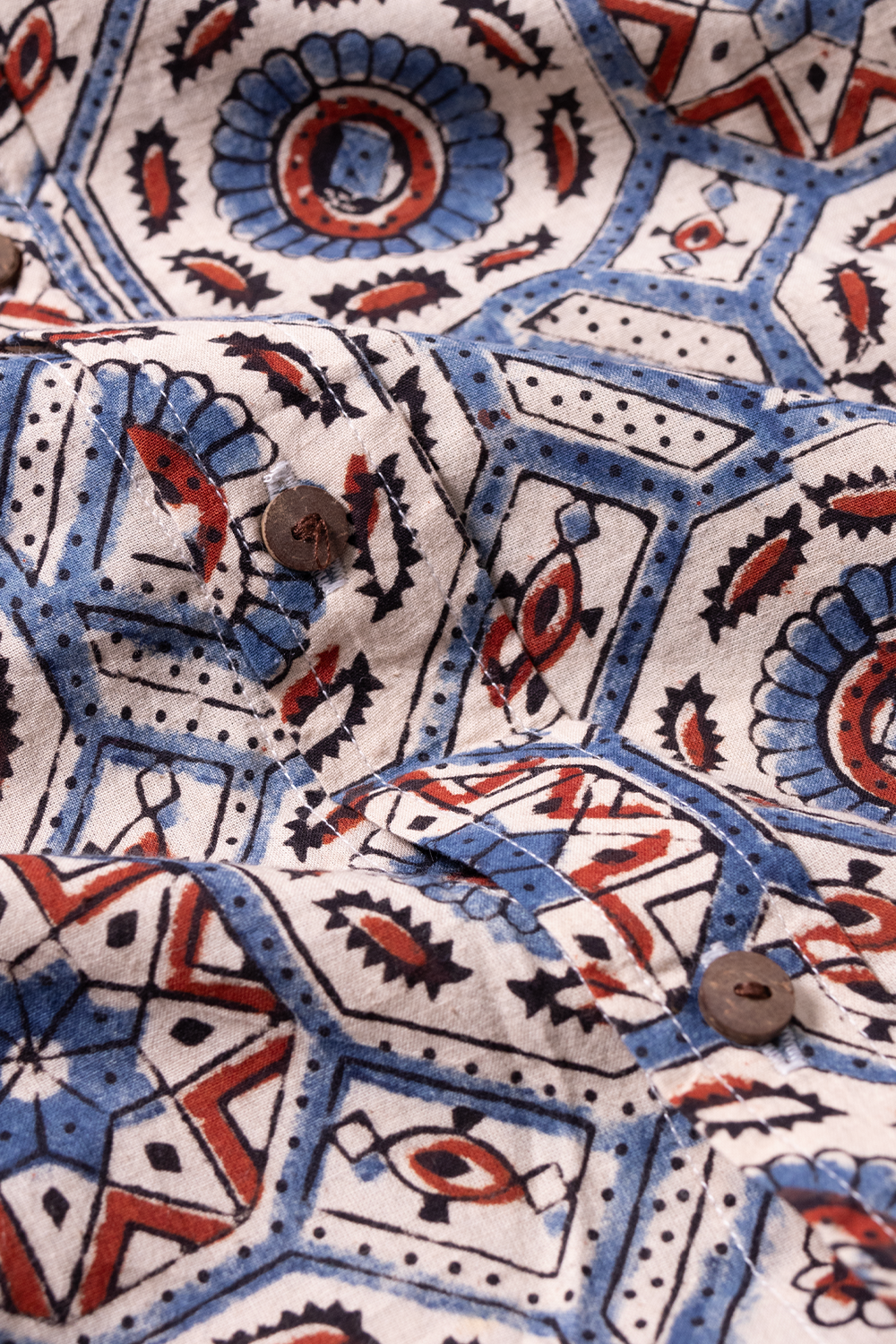 Experience the perfect blend of tradition and style with this Cream Ajrakh printed cotton shirt. Crafted using natural dyes and featuring authentic wooden buttons, it ensures comfort and sustainability. Easily pair it with jeans, khaki pants, or shorts to create a versatile, eye-catching outfit that highlights your unique fashion sense.