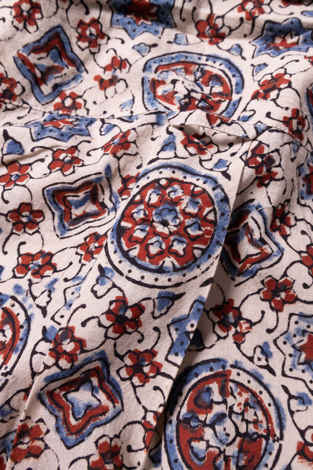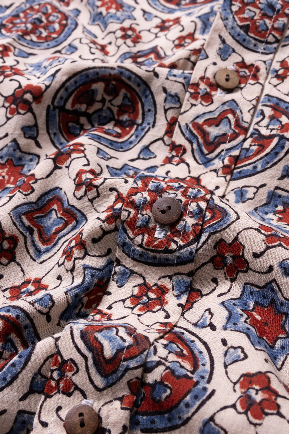 Experience the perfect blend of tradition and style with this Cream Ajrakh printed cotton shirt. Crafted using natural dyes and featuring authentic wooden buttons, it ensures comfort and sustainability. Easily pair it with jeans, khaki pants, or shorts to create a versatile, eye-catching outfit that highlights your unique fashion sense.