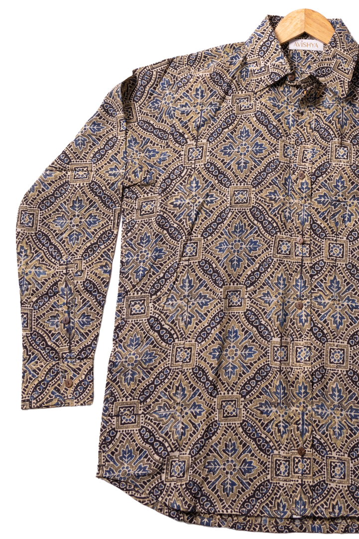 Experience the perfect blend of tradition and style with this Green Ajrakh printed cotton shirt. Crafted using natural dyes and featuring authentic wooden buttons, it ensures comfort and sustainability. Easily pair it with jeans, khaki pants, or shorts to create a versatile, eye-catching outfit that highlights your unique fashion sense.