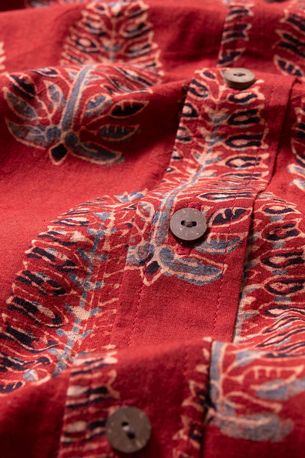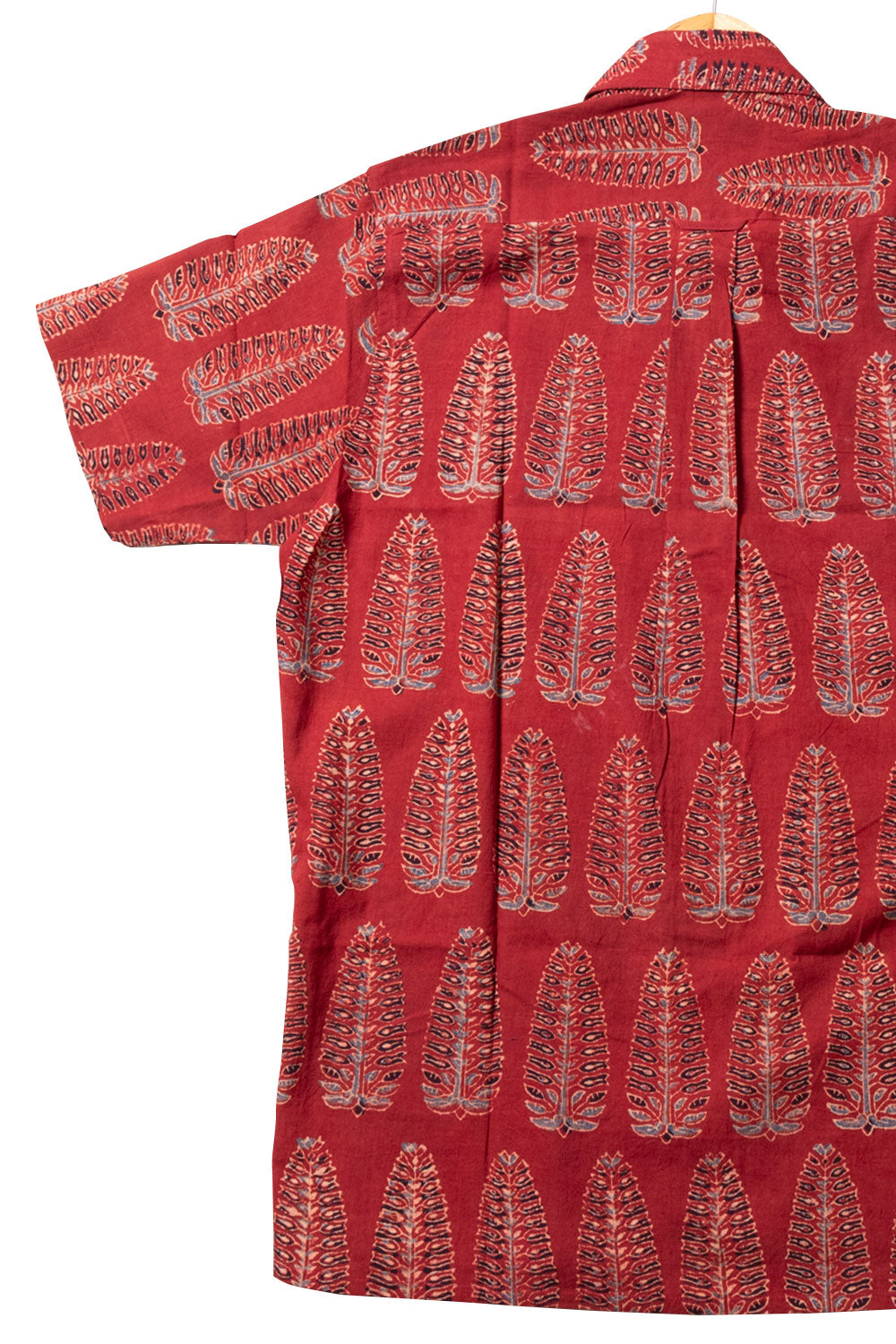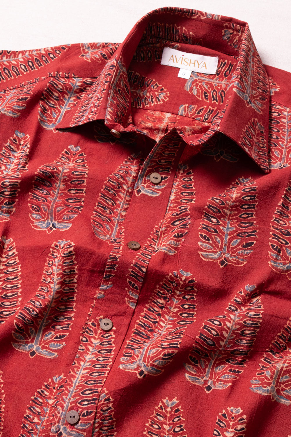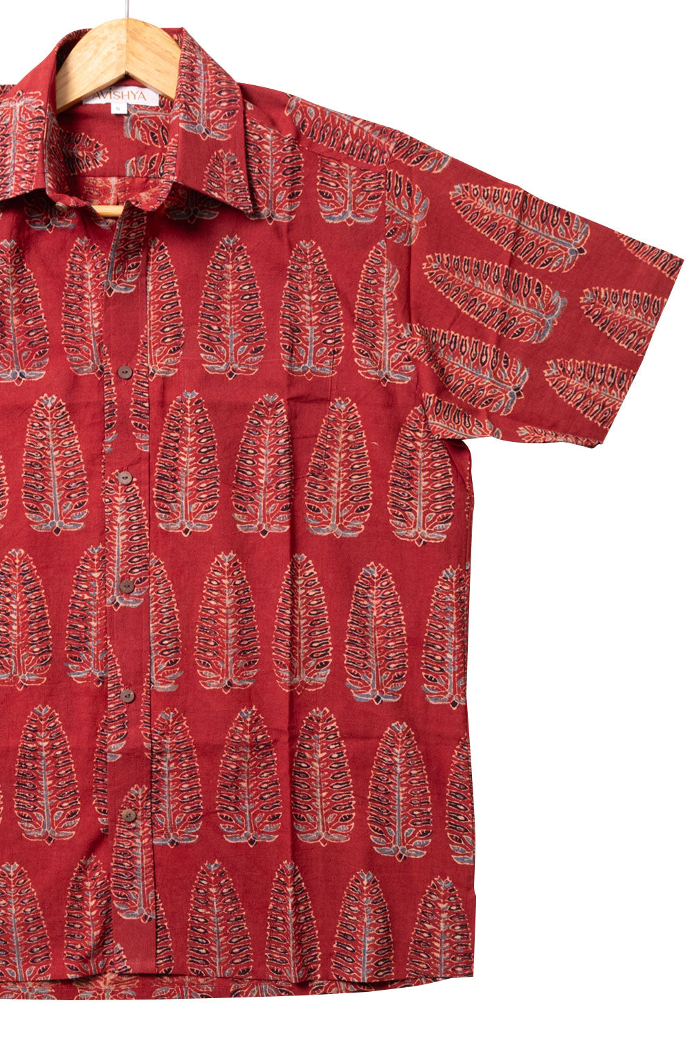Experience the perfect blend of tradition and style with this Maroon Ajrakh printed cotton shirt. Crafted using natural dyes and featuring authentic wooden buttons, it ensures comfort and sustainability. Easily pair it with jeans, khaki pants, or shorts to create a versatile, eye-catching outfit that highlights your unique fashion sense.