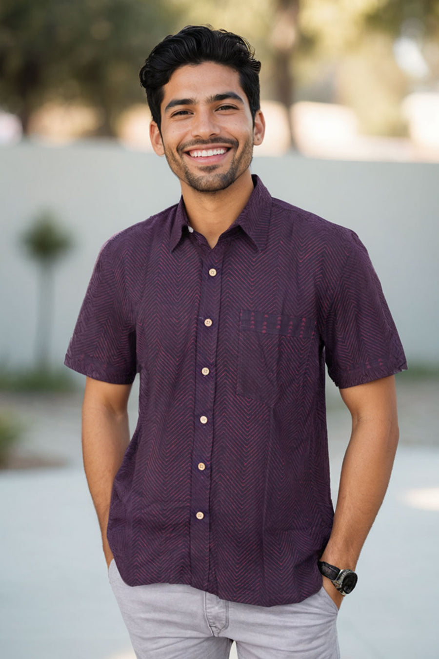 Experience the charm of this Maroon Bagh Hand Block Printed Cotton Shirt, adorned with eye-catching paisley patterns. Made from river-washed pure cotton, it ensures a soft, breathable feel perfect for Indian weather. Featuring ...