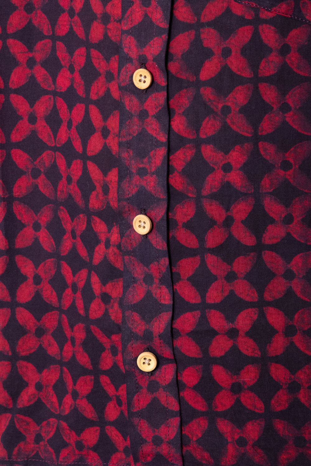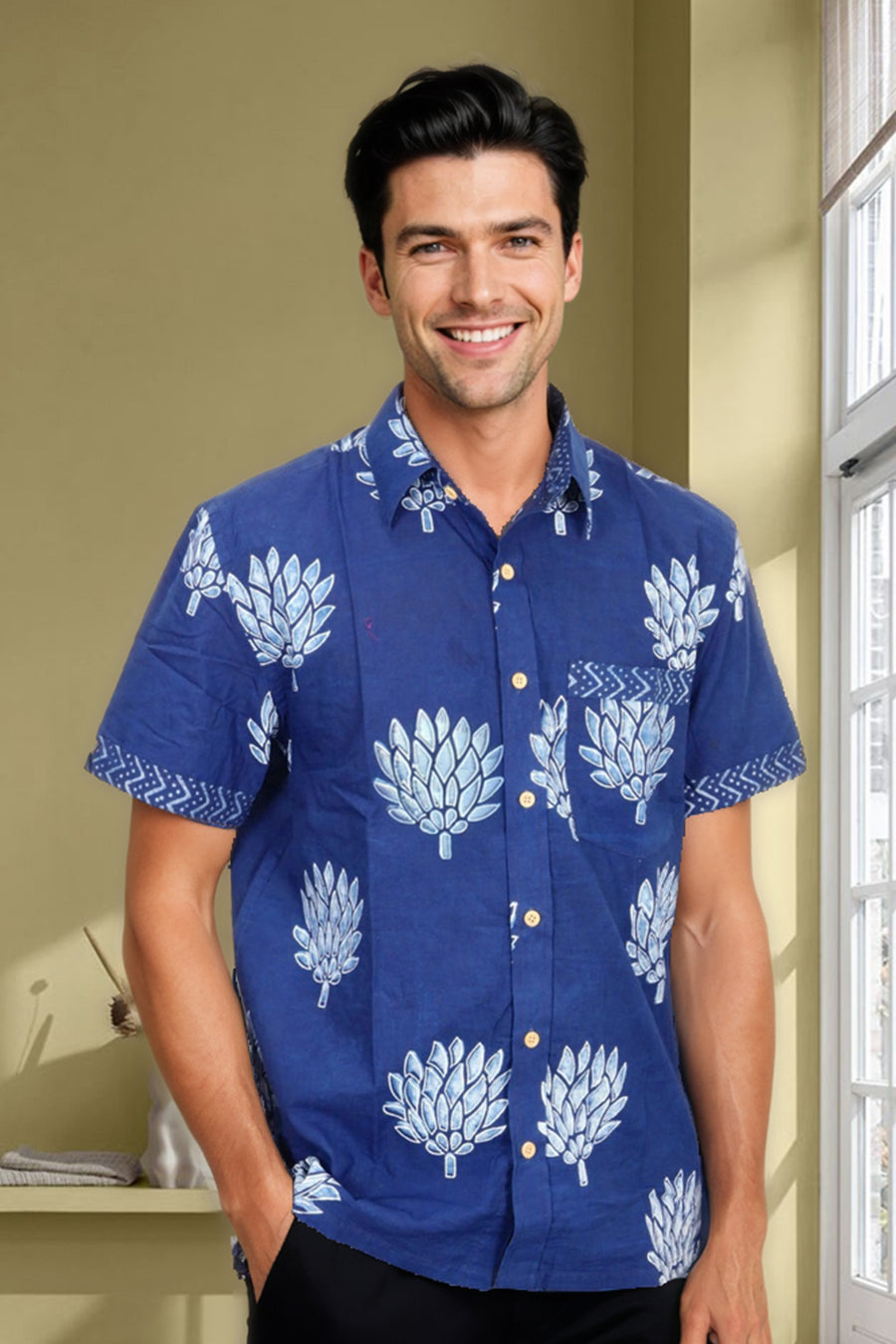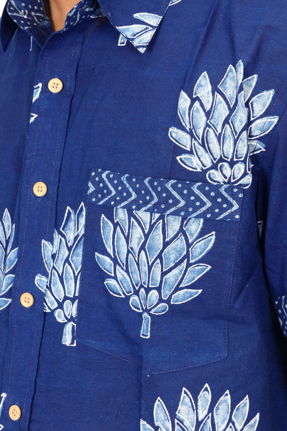 This Indigo Handblock Print shirt, made from pre-washed pure cotton, features wooden buttons and convenient pockets. Its versatile design pairs perfectly with jeans, khaki pants, or shorts, making it an essential addition to yo...