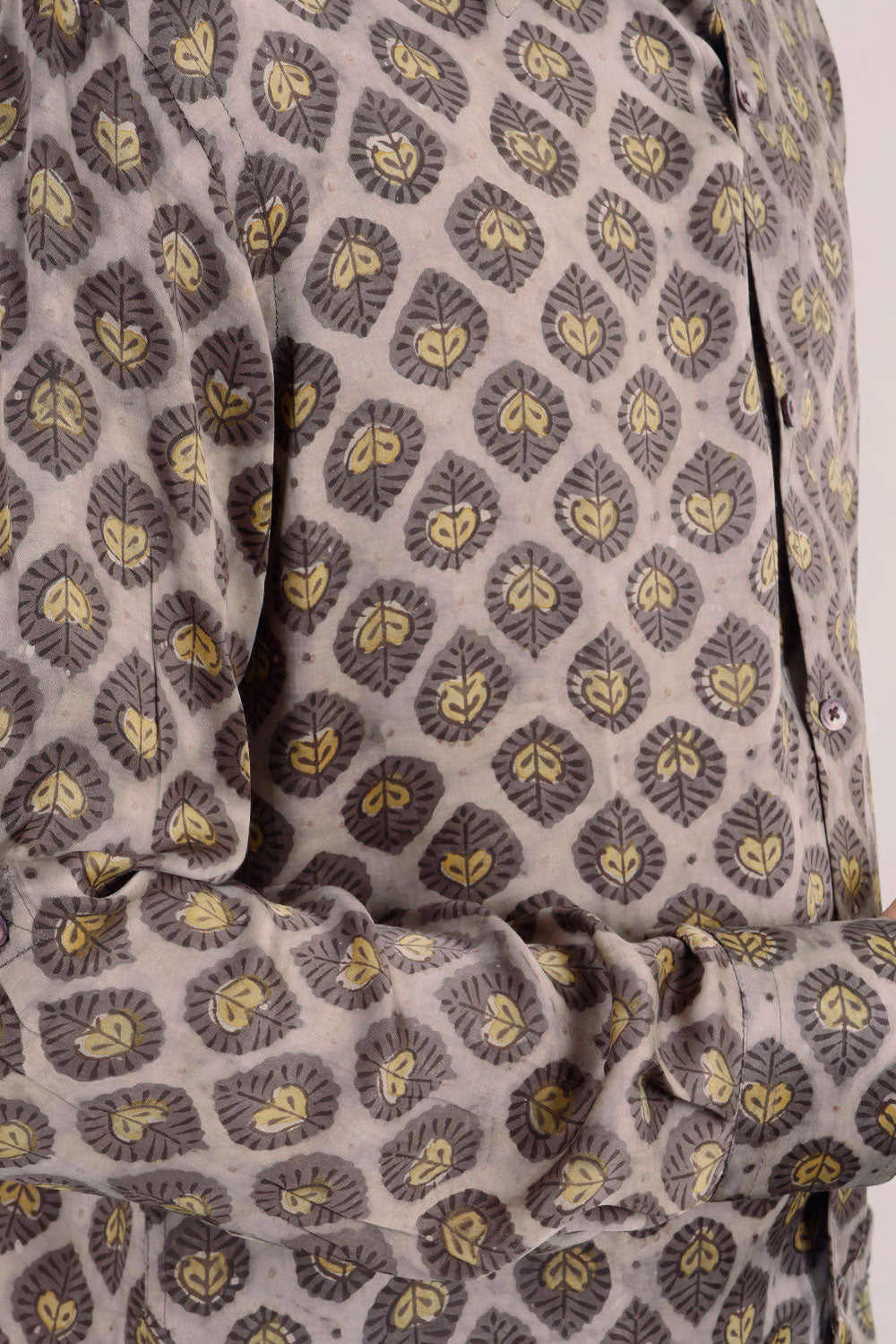 Elevate your casual wardrobe with this Grey Vanaspathi Printed Modal Silk Men's Shirt. It features stylish wooden buttons and convenient pockets for a functional yet fashionable look. Perfectly paired with jeans, khaki pants, t...
