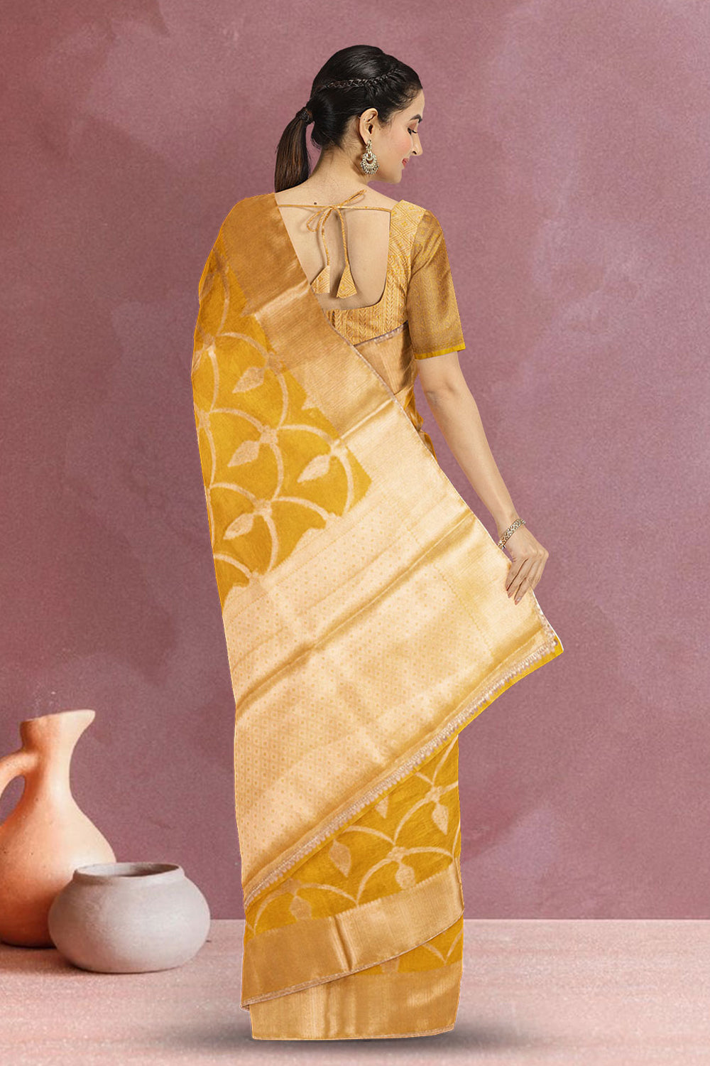 This vibrant yellow Banarasi Saree is crafted with Tissue Organza fabric featuring a delicate Sequin Border and intricate jaal design on the body. Experience the luxurious feel of tissue and elegance of Banarasi weaving. Perfect for weddings and special occasions, this saree is a must-have in your wardrobe!