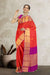 This Exquisite Coral Peach Handloom Kanjivaram Silk Saree boasts intricate Floral Motifs throughout, from the body to the Violet Border and Pallu. The exquisite Zari weaving adds a touch of elegance. Complete the look with the matching Violet Blouse.