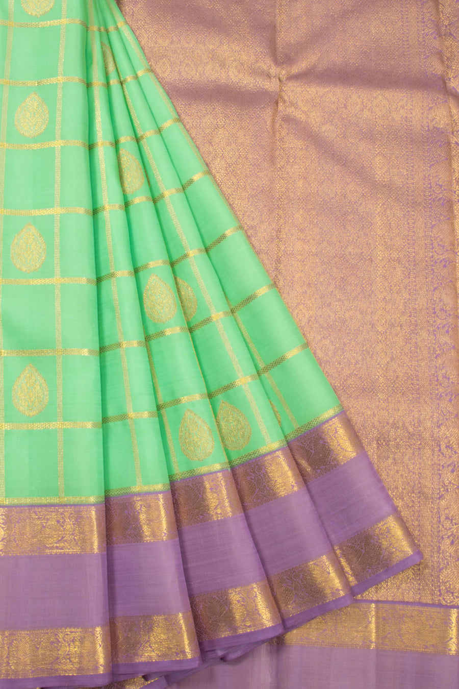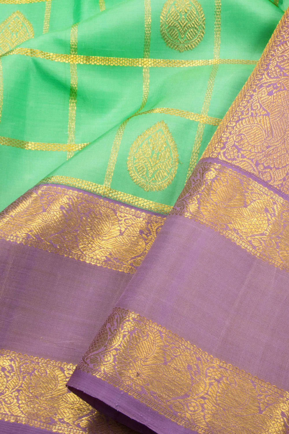 The Mint Green Korvai Bridal Kanjivaram Pure Zari Silk Saree combines refreshing color with exquisite craftsmanship. Woven from pure zari silk using the traditional Korvai technique, this saree offers a luxurious texture and el...